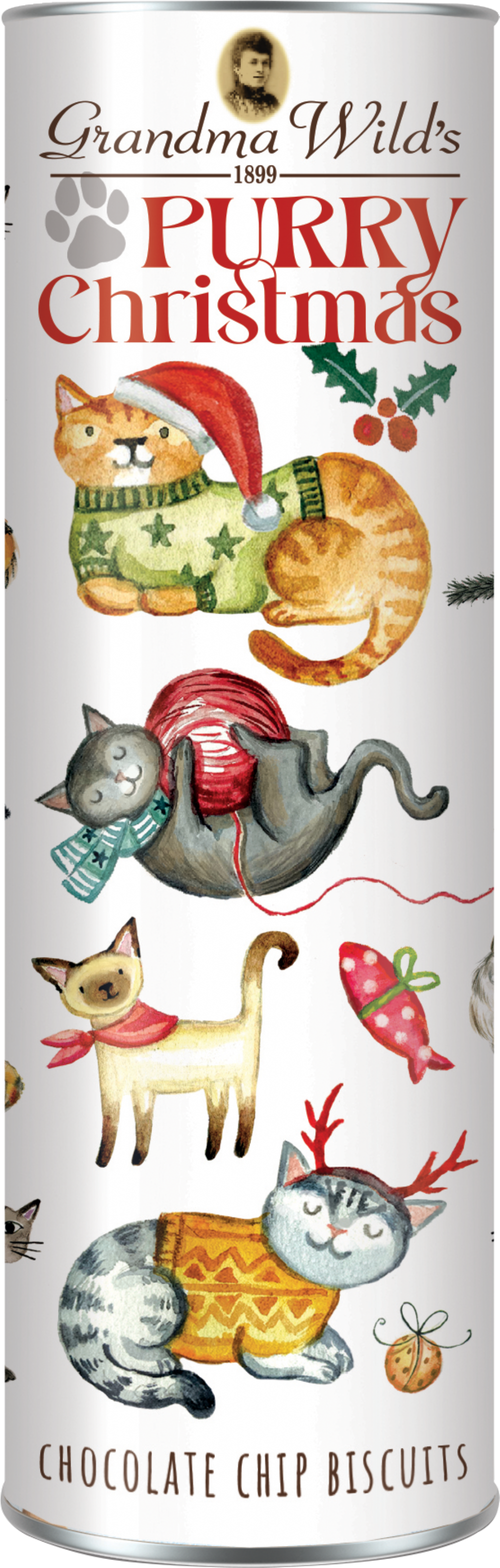 This beautifully designed tall tube, decorated with an adorable cats in Christmas jumpers theme specially for all the cat lovers, is filled with our Chocolate Chip Biscuits. Made with the finest ingredients, and scattered with dark chocolate chips, these moreish biscuits are a real tasty treat.Our novel tall tube of biscuits makes a thoughtful thank you gift or a lovely treat for yourself.