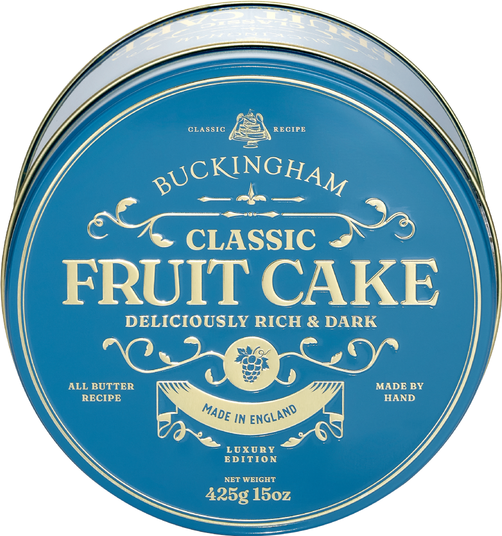 The original Buckingham recipe with over 45% fruit. This is where it all started. We've never changed the recipe and it's still our most popular cake. Made with pure butter, juicy sultanas, raisins, currants, sumptuous cherries, tangy orange and lemon peel and a pinch of spice. Deliciously rich, dark, moist and fruity. Proper old-fashioned fruit cake. The essential English cake which perfectly complements a good cup of tea or coffee. Packaged in a beautiful keepsake tin, exclusive to Buckingham, decorated with a specially commissioned design in embossed Victorian style.