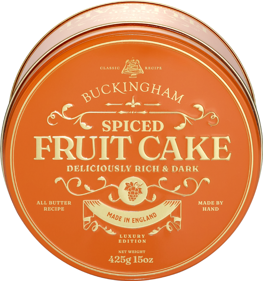 The classic Buckingham recipe with the cherries replaced by apricots and orange oil, enhanced with a very generous pinch of spices. Made with pure butter, juicy sultanas, raisins, currants, sumptuous apricots, tangy orange and lemon peel, orange oil and plenty of spices: cinnamon, coriander, ginger, allspice, nutmeg and cloves. Deliciously rich, dark, moist and spicy. The apricots add an extra special taste; the orange oil and orange peel give a citrus zing! But not too strong, still allowing the full flavour of the vine fruits to come through. Packaged in a beautiful keepsake tin, exclusive to Buckingham, decorated with a specially commissioned design in embossed Victorian style.