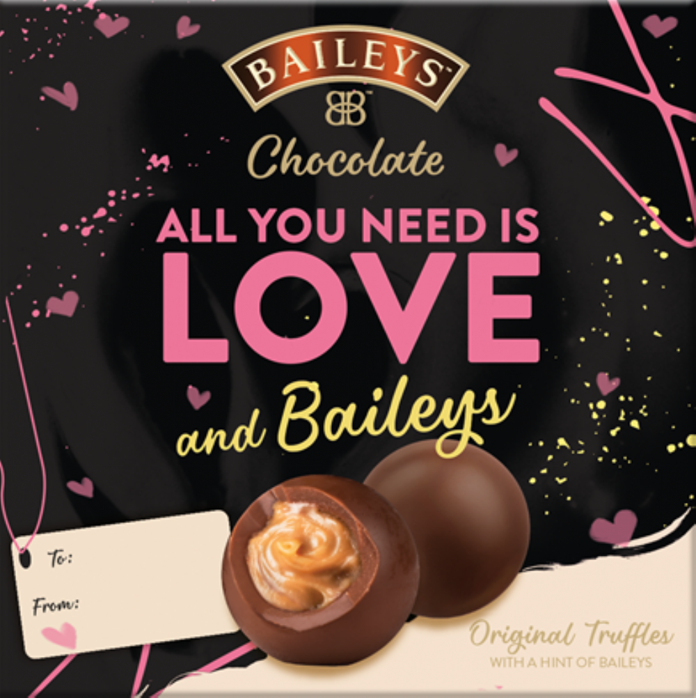Sugar, Cocoa Butter, Dried Whole Milk, Cocoa Mass, Baileys Original Irish Cream Liqueur (8.3%) (Milk), Vegetable Oils (Palm, Rapeseed, Sunflower), Water, Dried Skimmed Milk, Glucose Syrup, Humectant (Sorbitol Syrup), Dextrose, Emulsifier (Soya Lecithin), Flavourings.