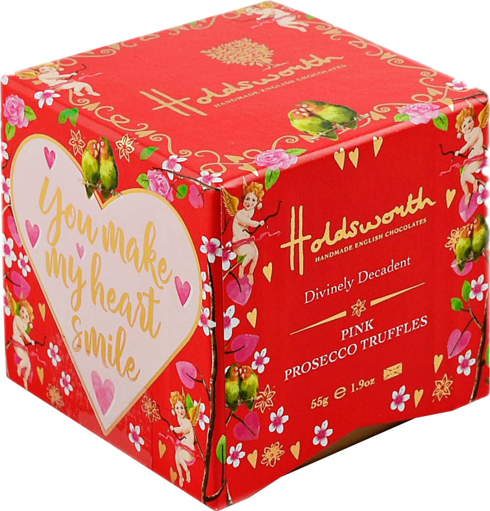 A petite collection of handmade ganache truffles blended with Prosecco, infused with natural lemon, pear & grapefruit. Enrobed in creamy white chocolate. Hand packed into a beautiful bold, ‘I Love You’ petite cube.