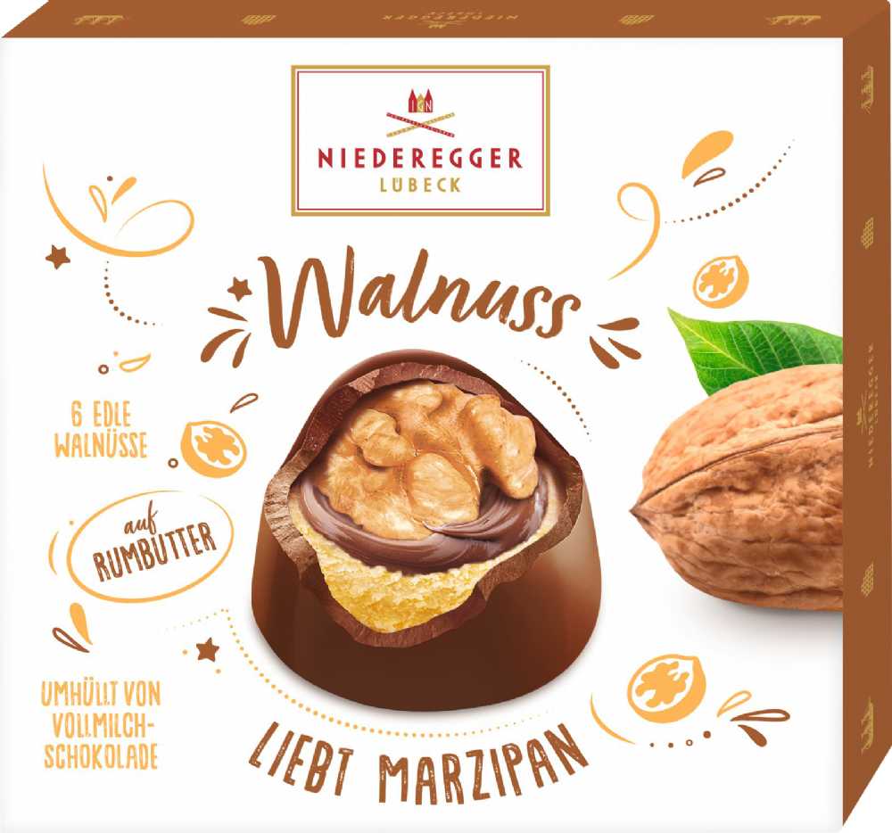 Discover marzipan pralines 'Walnut on marzipan': a harmonious composition of juicy almond marzipan, creamy rum butter and melt-in-the-mouth milk chocolate, finely accentuated with dark chocolate. Whether as a stylish gift, a small everyday treat or an elegant accompaniment to coffee - these pralines impress with their balanced flavour, crunchy walnut half and delicate sweetness. A carefully balanced recipe and high-quality ingredients ensure a pleasant texture ranging from crunchy to creamy. Ideal for enhancing special moments or offering guests something special. Help yourself and enjoy classic confectionery quality in every Praline. Perfect for gourmets who appreciate authentic ingredients and clear flavours.