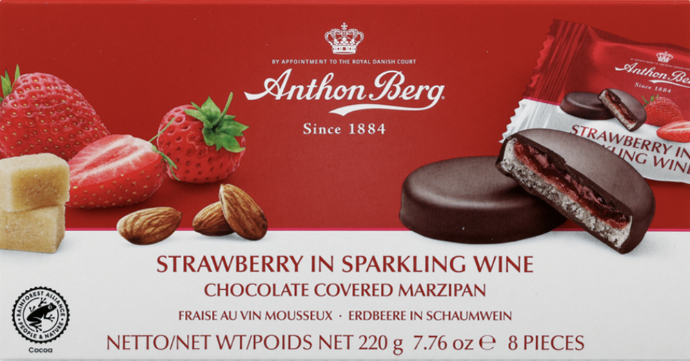Sugar, Almonds 21%, Cocoa Mass, Strawberries 9%, Glucose Syrup, Water, Cocoa Butter, Wines (Sparkling Wine 1.3%, White Wine), Alcohol, Milk Fat, Flavouring, Emulsifier (Lecithin), Acid (Citric Acid), Thickener (Pectin), Preservatives (Sorbic Acid, Potassium Sorbate), Acidity Regulator (Trisodium Citrate).