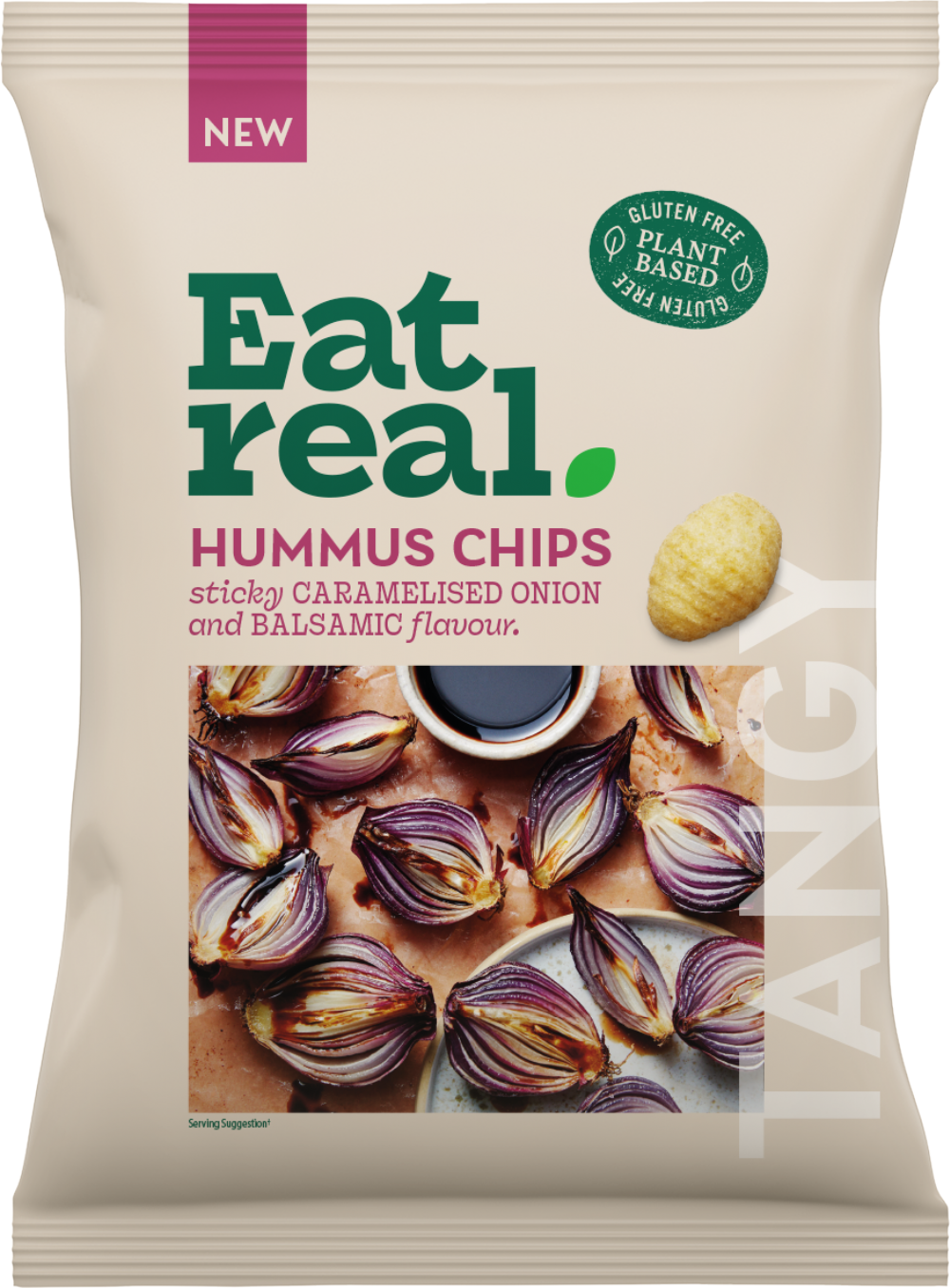 Crunchy hummus chips with sweet caramelised onions and a drizzle of balsamic vinegar.