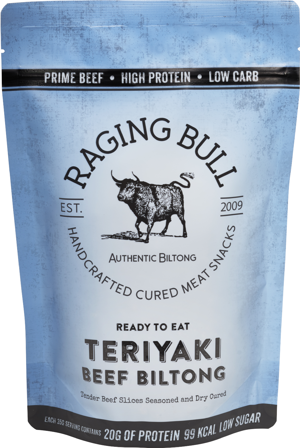 Beef (250g per 100g of Biltong), Cider Vinegar, Teriyaki Sauce (Hydrolysed Protein (from Soya), Sweet Rice Wine, Soya Sauce, Modified Starch, Brown Sugar Syrup, Fermented Soya Bean Paste, Ginger, Wheat, Hickory Smoke), Seasoning Mix (Salt, Spices (Coriander, Black Pepper), Caster Sugar), Flavouring (contains Yeast Extract, Salt, Maltodextrin, Caramelised Sugar, Sunflower Oil, Flavourings (Process Flavourings, Natural Flavours)), Preservative (Potassium Sorbate).