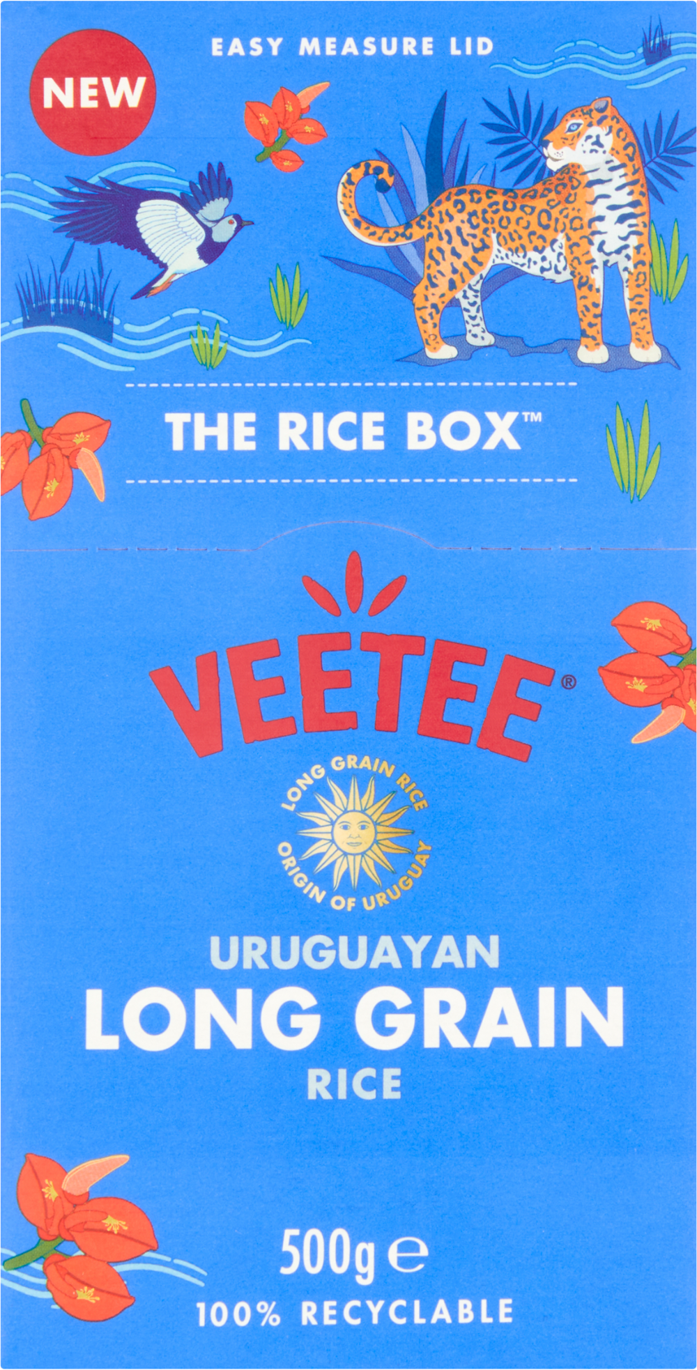 Simply slide off the lid of Veetee's convenient 100% recyclable rice box and use the measuring line marked to portion out the rice. No spills. No mess. No plastic. No fuss, no hassle and no waste. This delicious and wonderfully versatile long grain rice is cultivated in the lush basins of the Cebollati, Olimar and Tacuari rivers of Latin America and nurtured to perfection by year-round rainfall. The rice grains remain separate and fluffy after cooking - making it perfect for all rice dishes, especially Creole and Cajun cuisine. If the finest easy-cook, tasty, fluffy rice is what you're looking for... congratulations, you've just found it.