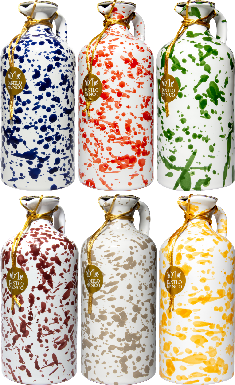 These ceramic bottles are handmade by expert artisans in Puglia; each is unique because it is decorated by hand. Each is filled with premium Italian Extra Virgin Olive Oil, used to enhance all sorts of dishes. To open, use a corkscrew or a lever can opener, as you would with a bottle of wine.