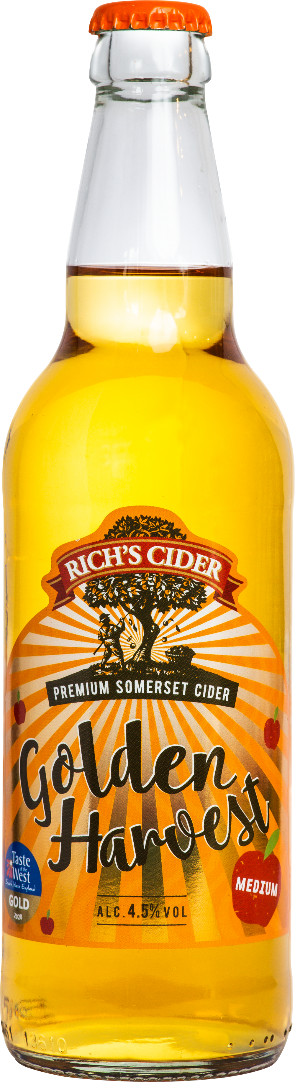 Golden Harvest is our 4.5% ABV cider. It is a light, refreshing cider, slightly sparkling in our bottles or still in our boxes, with added apple juice which gives it a fruity aroma.