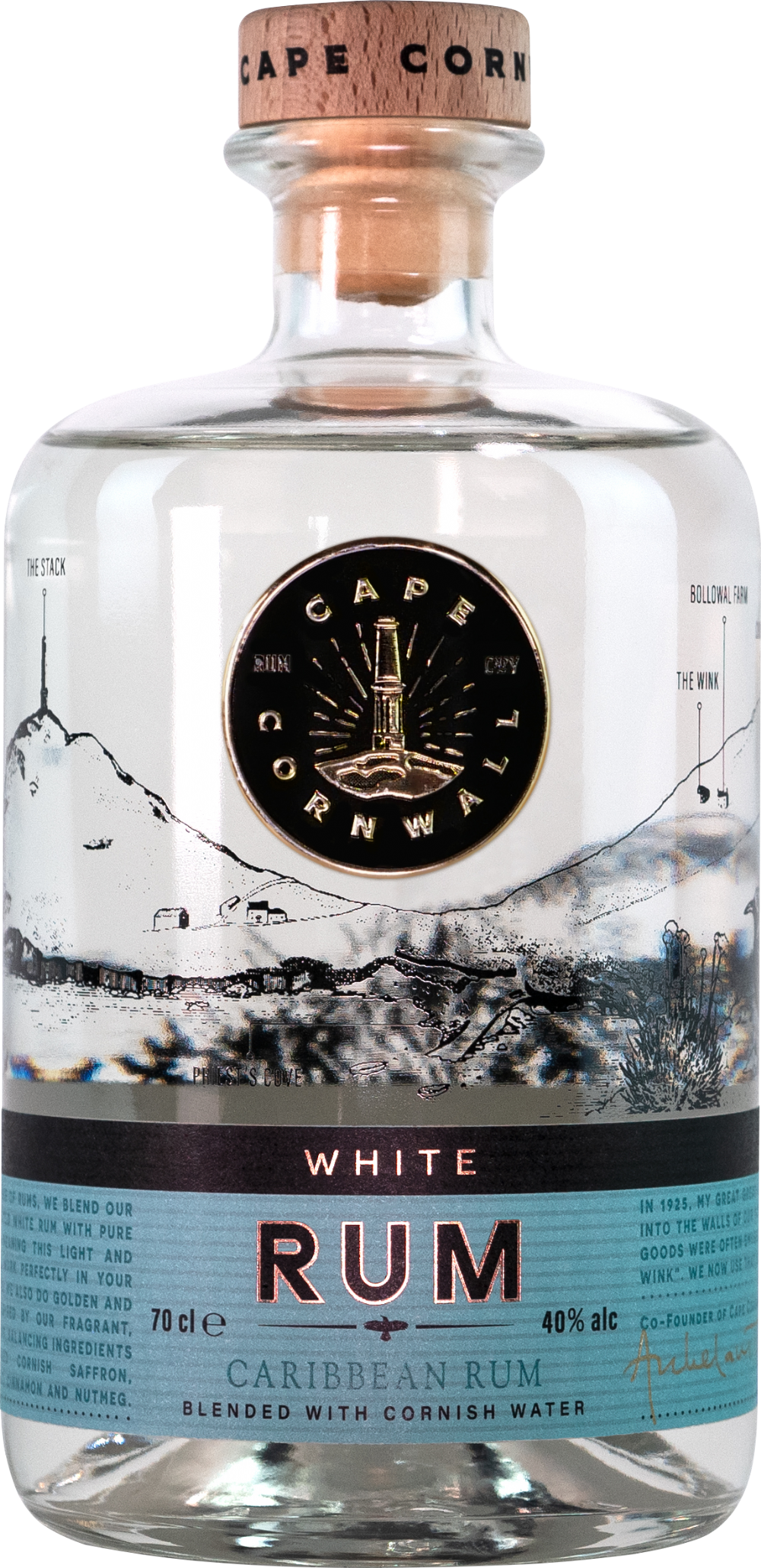 Our vibrant White Rum is a blend of 2 and 5 year old, steel pot distilled rum born in Trinidad. Once distilled the rum is charcoal filtered to provide the cleanest and most distinctive of flavours before being finally finished with our locally sourced Cornish spring water. When the time is right our white rum is then independently hand bottled and labelled here in the depths of West Cornwall. Cape Cornwall white rum provides the ideal cocktail or mixer base and is abundant in fruity flavours with a outstanding qualities!