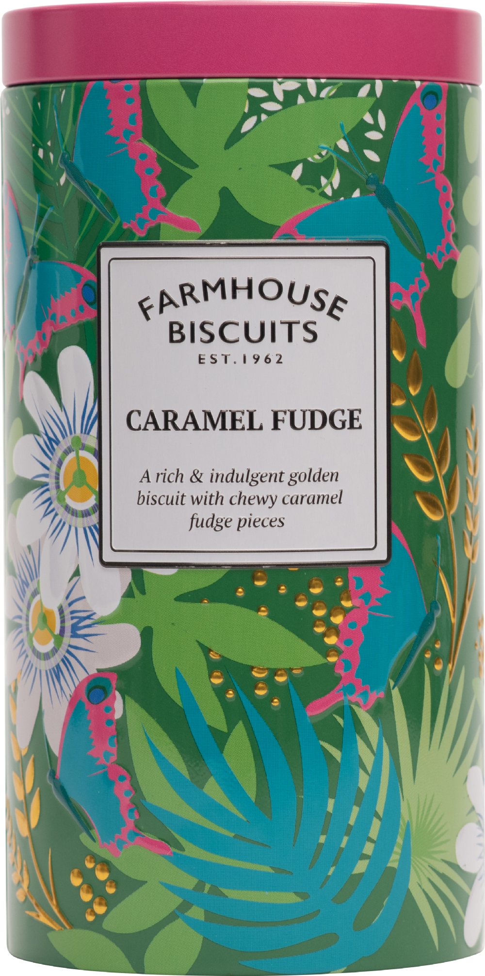 Farmhouse Biscuits Caramel Fudge Biscuits in Tropical Bright Tin 200g