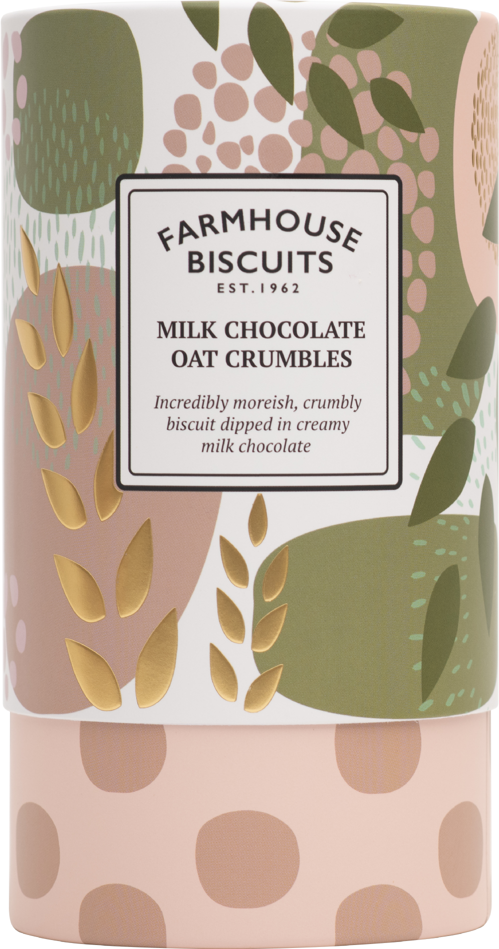 Milk Chocolate Oat Crumble Biscuits in Abstract Tube 160g from Farmhouse Biscuits.