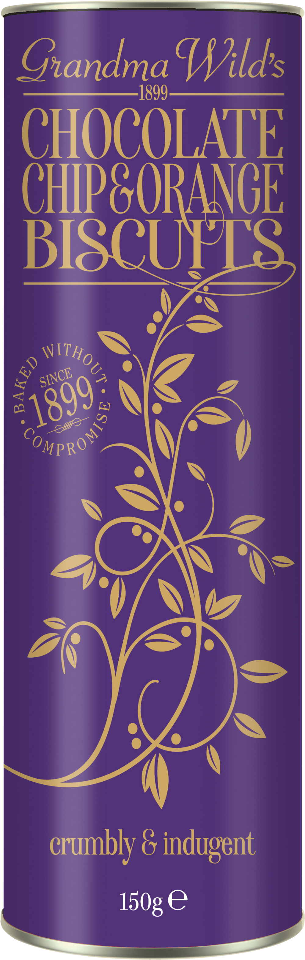 GRANDMA WILD'S Chocolate Chip & Orange Biscuits in Ornate Tube 150g from Grandma Wild's.