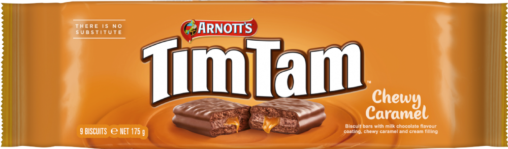 Tim Tam Chewy Caramel biscuits are made with a mouth-watering combination of crunchy biscuit, chewy caramel centre, wrapped in a smooth chocolate coating. It's easy to see why Tim Tam is Australia's most-loved chocolate biscuit.