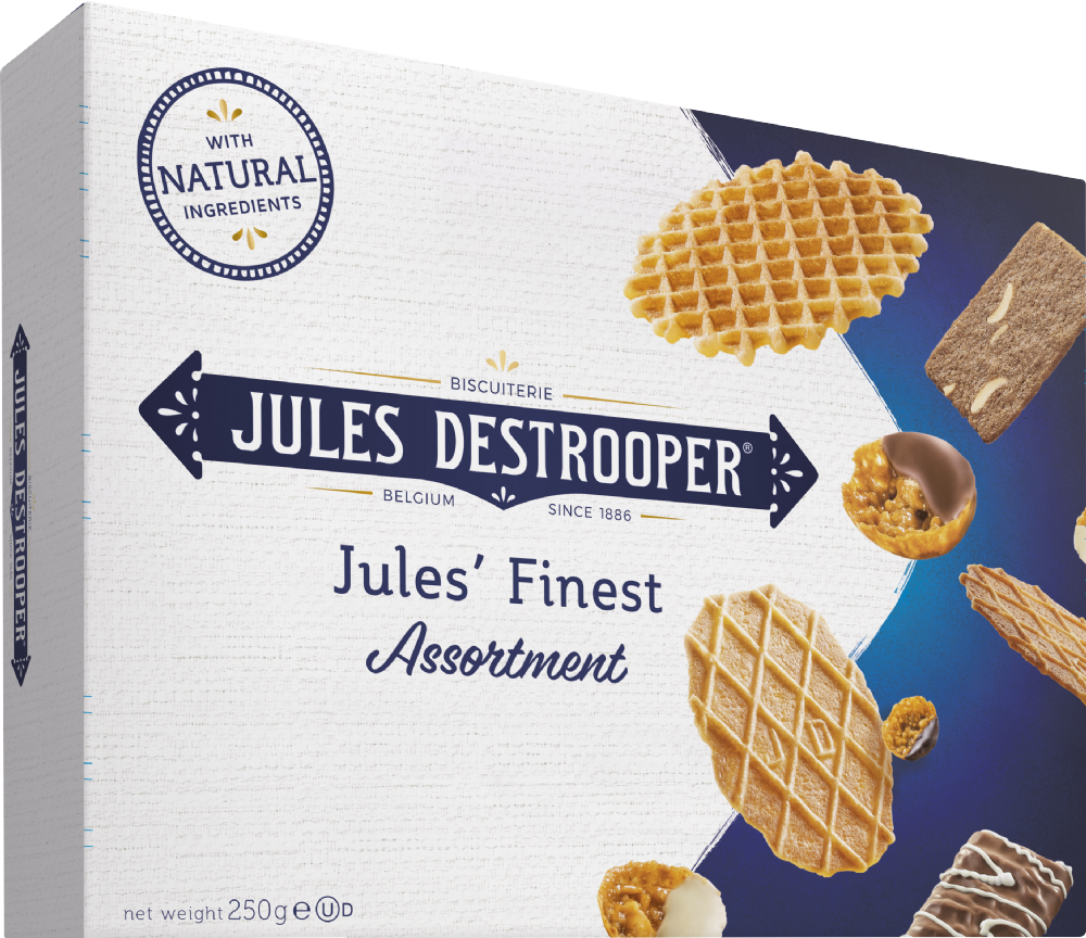 A diverse assortment with a mix of butter and chocolate biscuits: almond thins, butter crisps, butter waffles, almond florentines and caramelised milk chocolate biscuits.