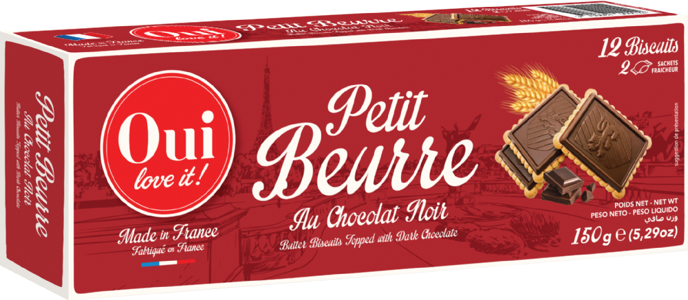 A delicious biscuit generously coated in rich dark chocolate! Oui, oui oui! We'll take your taste buds to faraway places! It has been said that the Petit Beurre was created in Nantes in 1886. Mainly made of wheat flour and butter, the cookie is topped with dark chocolate that makes it truly delicious. Packed into 2 sachets for freshness, they're easy to transport to brighten up your day where ever you are.