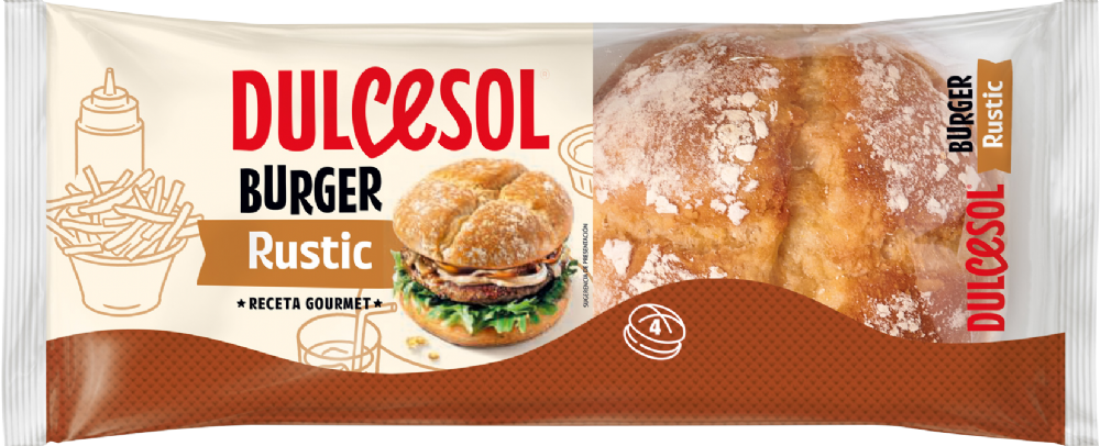 Discover the new rustic burger from Dulcesol with the texture of traditional bread and lightly floured crust. Made with corn grits and malt flour as main ingredients. Also with 100% biodegradable packaging. Good on the inside and now on the outside too!