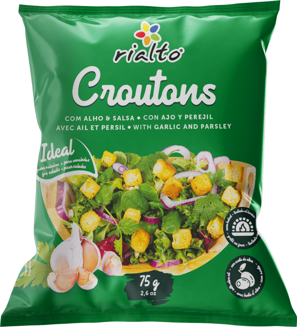 Made with olive oil, these herby croutons are ideal for accompanying salads and soups. Oven baked not fried and a source of fibre.Â