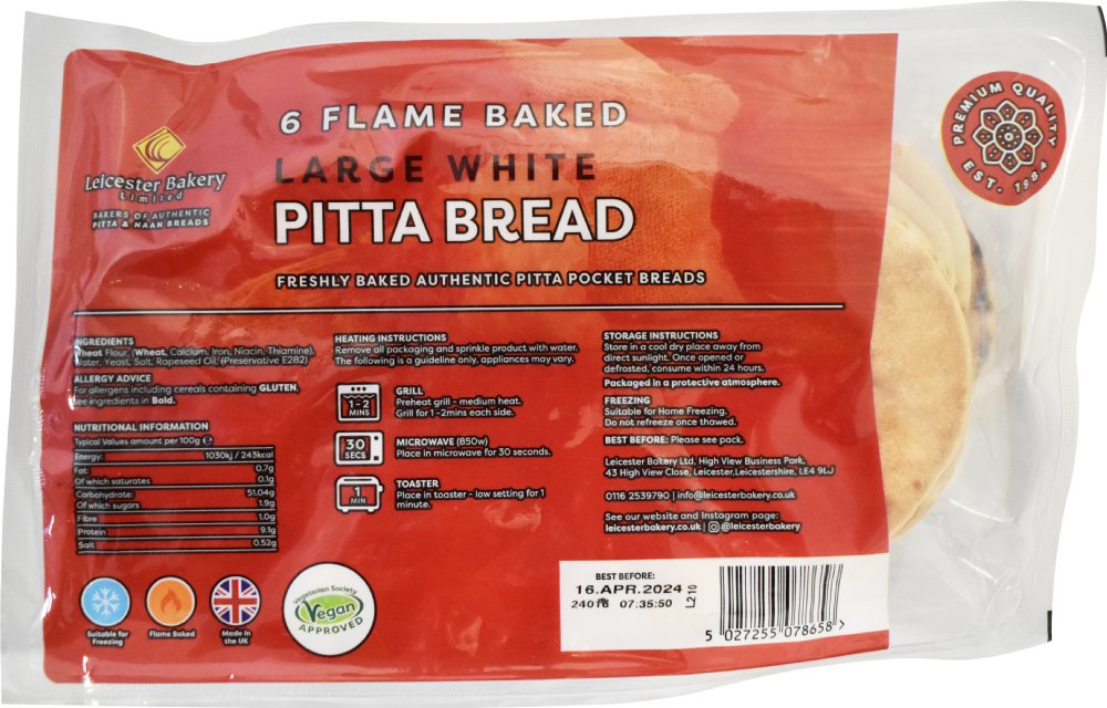 Oval shaped Pitta Breads, best used as a pocket to fill with meat, salads and any other fillings of your choice. Also can be used as an accompaniment with curries. Delicious warm or cold.