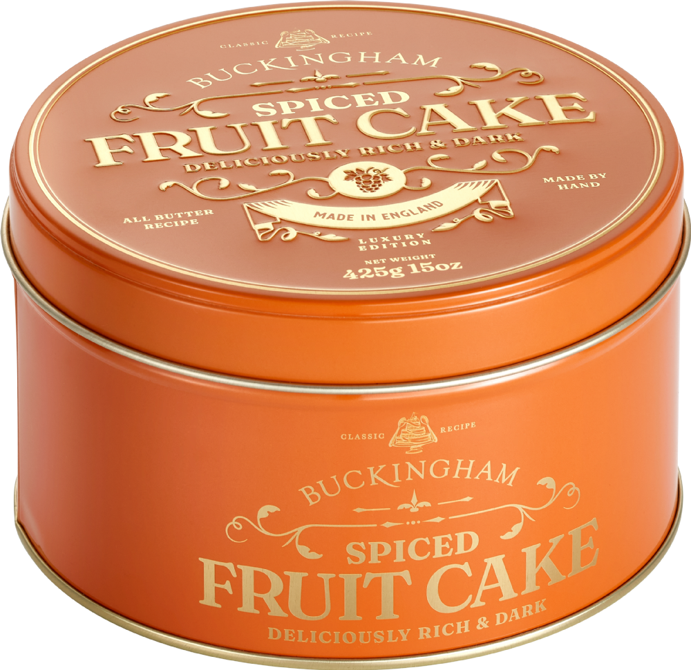 The classic Buckingham recipe with the cherries replaced by apricots and orange oil, enhanced with a very generous pinch of spices. Made with pure butter, juicy sultanas, raisins, currants, sumptuous apricots, tangy orange and lemon peel, orange oil and plenty of spices: cinnamon, coriander, ginger, allspice, nutmeg and cloves. Deliciously rich, dark, moist and spicy. The apricots add an extra special taste; the orange oil and orange peel give a citrus zing! But not too strong, still allowing the full flavour of the vine fruits to come through. Packaged in a beautiful keepsake tin, exclusive to Buckingham, decorated with a specially commissioned design in embossed Victorian style.