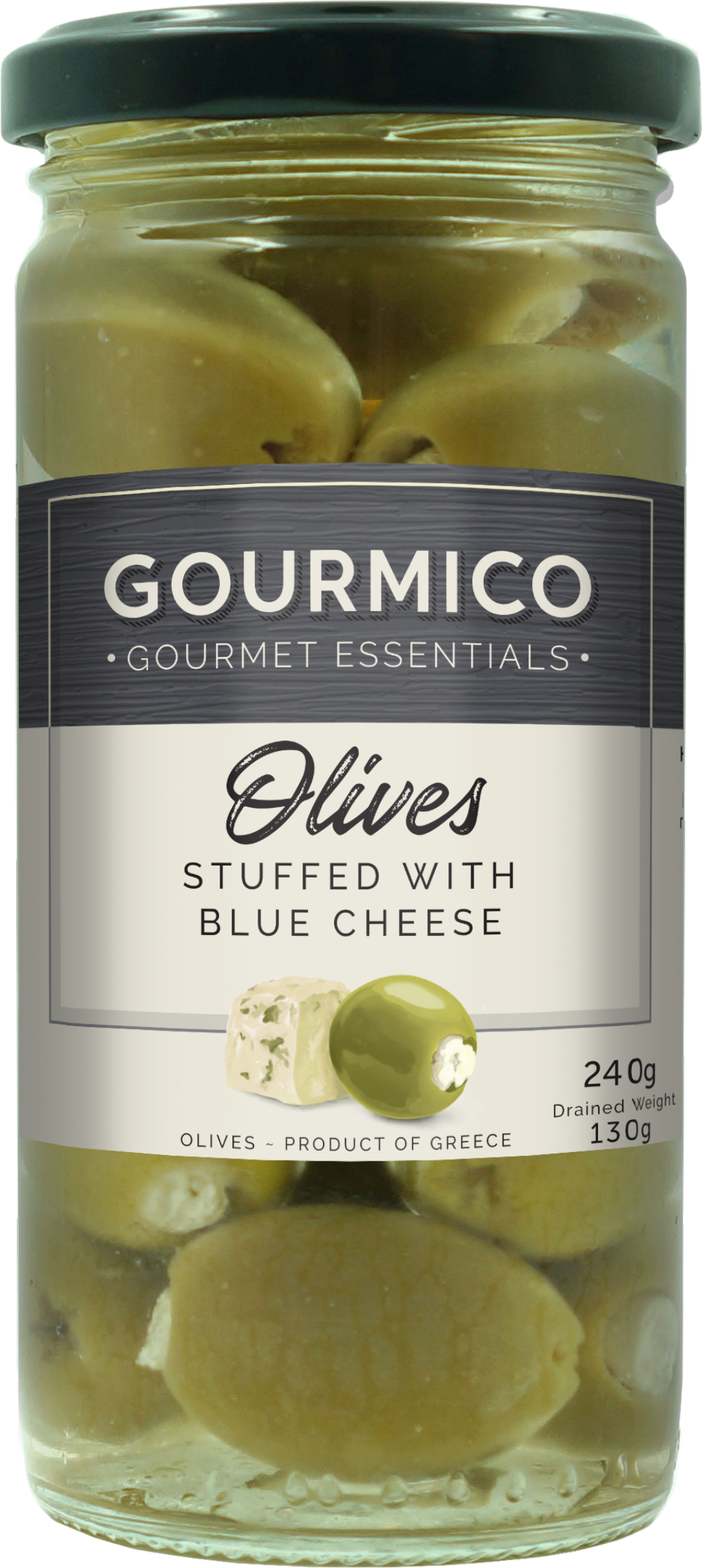 Green Olives Pitted (46%), Water, Blue Cheese (EU) (4.9%) (Cow’s Milk, Cheese Culture, Rennet, Salt, Penicillium roqueforti), Cream Cheese (3.2%) (Skimmed Milk, Cream, Salt, Lactic Acid Culture), Sea Salt, Acidity Regulator (Lactic Acid), Acidity Regulator (Citric Acid), Stabiliser (Xanthan Gum), Stabiliser (Locust Bean Gum).