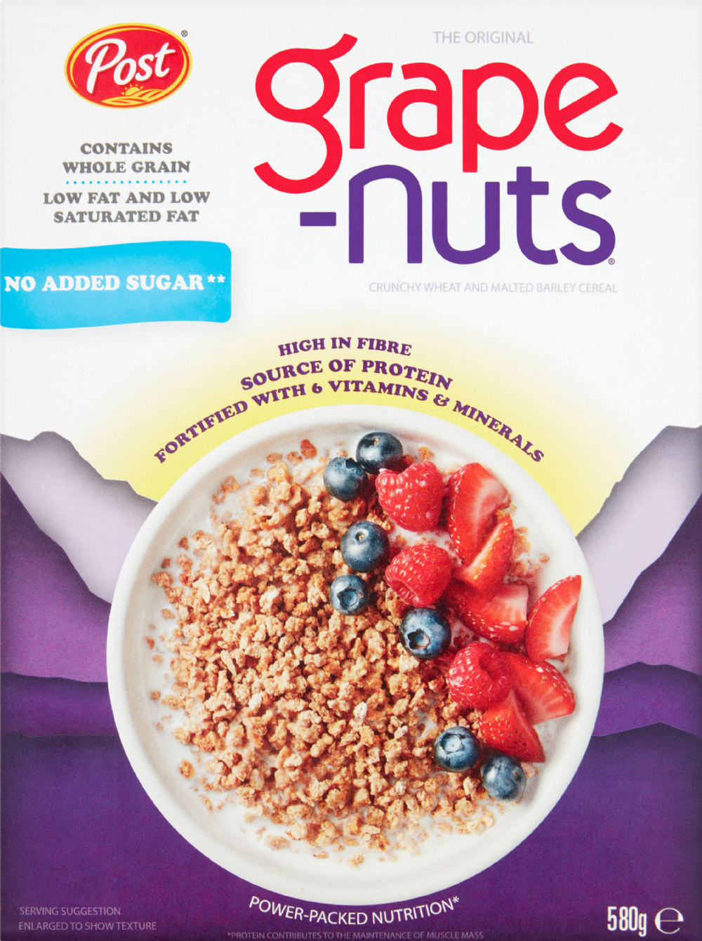 Developed in 1897, Grape-Nuts is a timeless and versatile cereal product. It has been a morning staple for generations, and a healthy recipe ingredient as it packs the nutritional power to meet the demands of today’s modern, active lifestyle. Made with wholesome ingredients and fortified with vitamins and minerals, Grape-Nuts is an excellent source of fibre too.