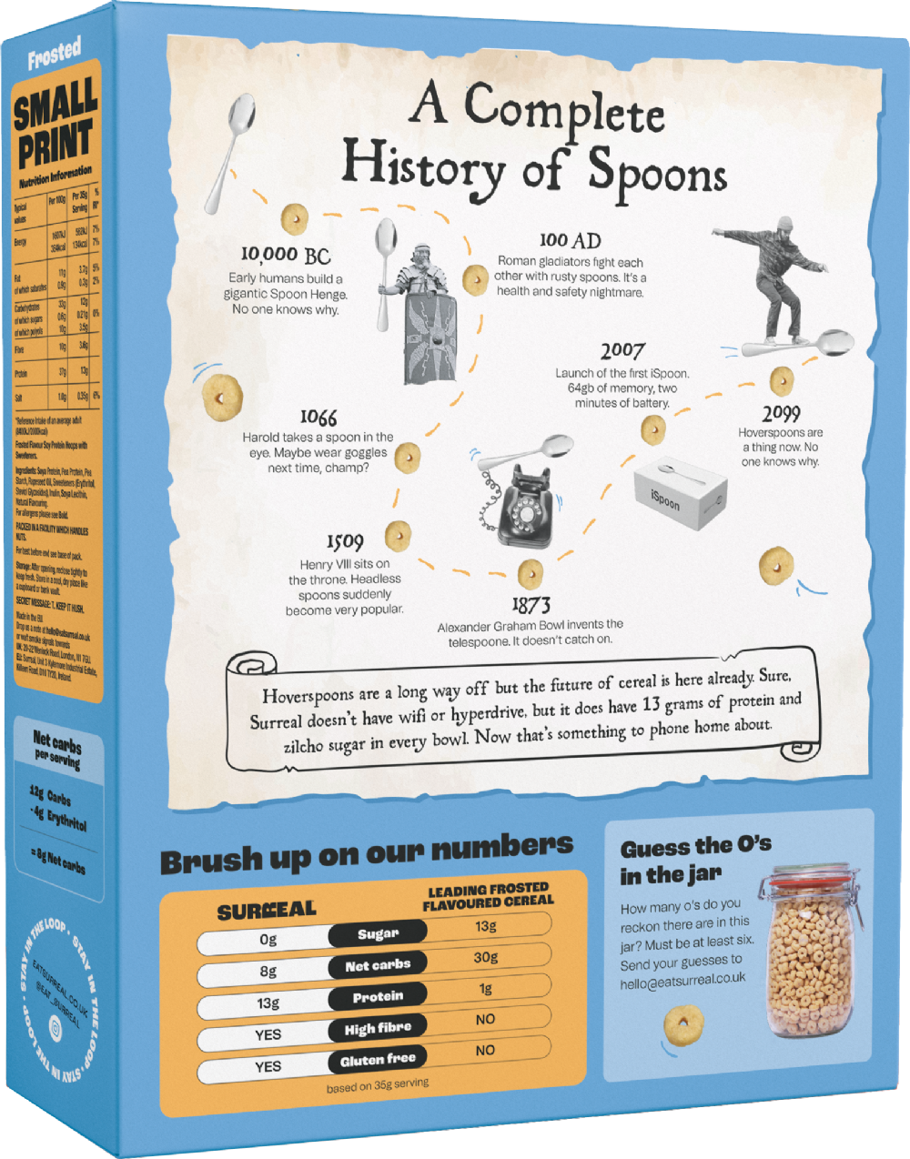 Want to satisfy your sweet tooth without a sugar overdose? Surreal’s high protein Frosted Cereal is just what you need. Each bowl has 13g protein, and 0g sugar, making it the perfect sweet treat. No tigers were hurt in the making of this Surreal, but Tony's feelings might well have been.