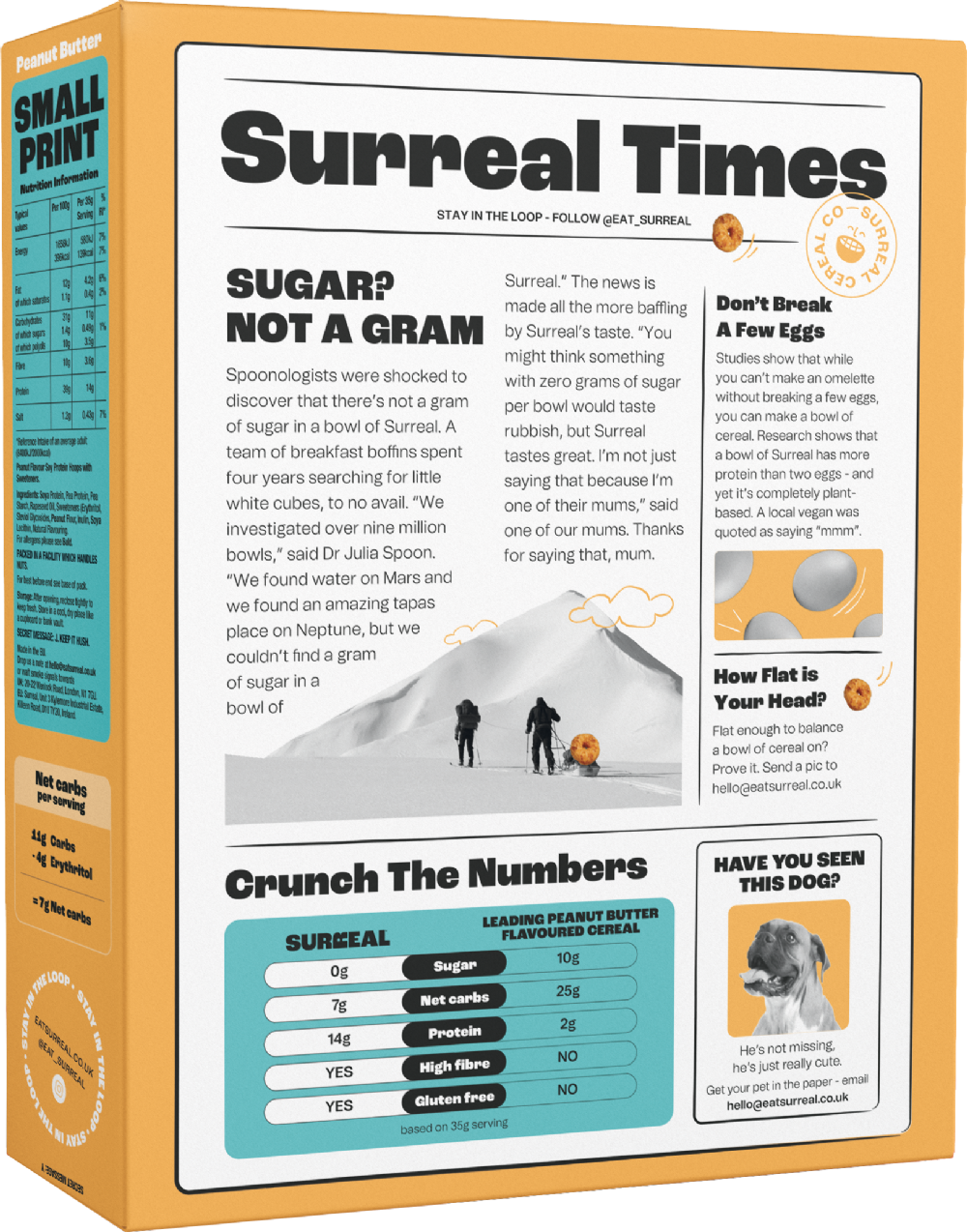 Surreal’s high protein Peanut Butter cereal has all the creamy, nutty taste of your favourite spread. And with 14g protein and 0g sugar, it’s packed full of good stuff. We could say you'll go nuts for this, but we're above such things.