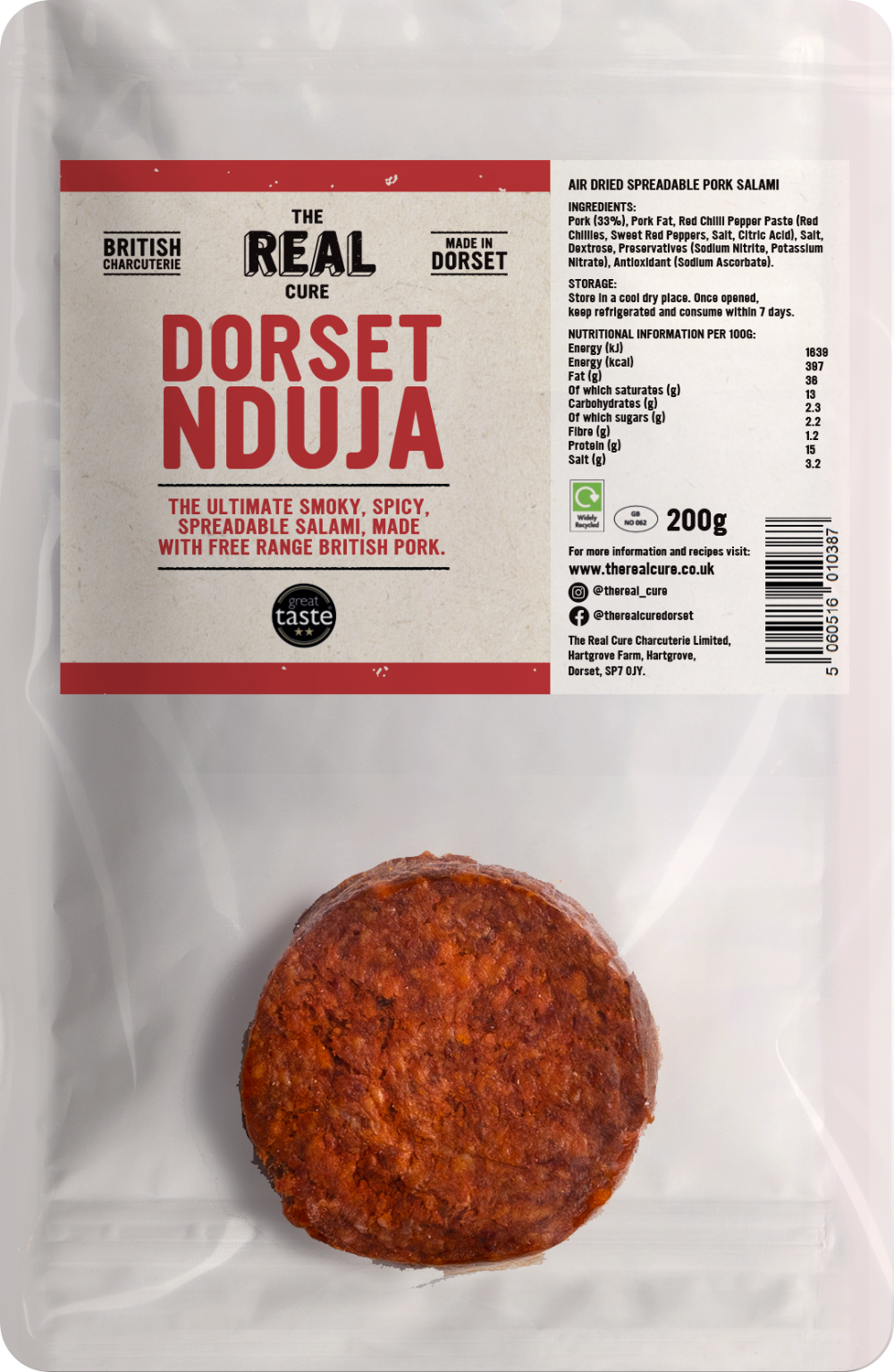 Made from free range British pork combined with hot Calabrian chillies, this is our Dorset take on the Calabrian classic, Nduja. The depth of flavour of the Dorset Nduja makes it perfect for adding flavour and heat to recipes such as pasta, sauces, pizza or simply enjoy spread on sourdough toast.