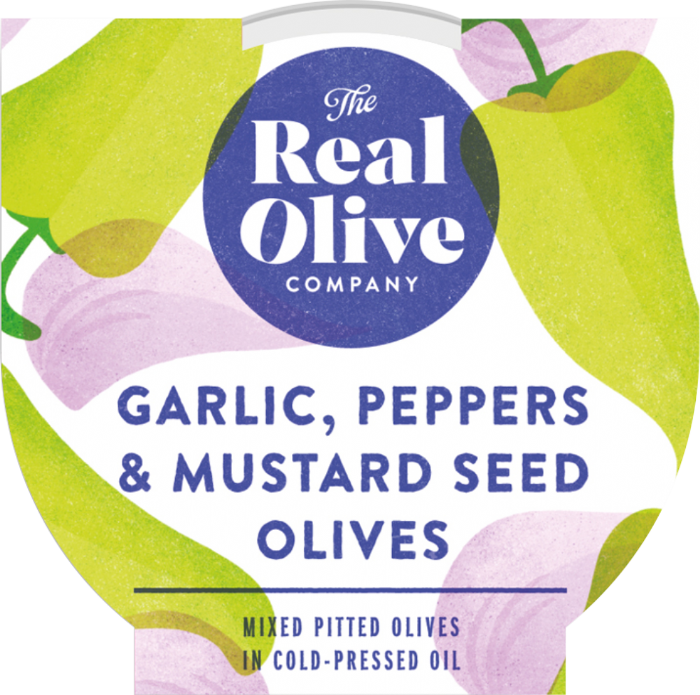 THE REAL OLIVE COMPANY Garlic, Peppers & Mustard Seed Pitted Olives - Deli Pot 160g from The Real Olive Company.