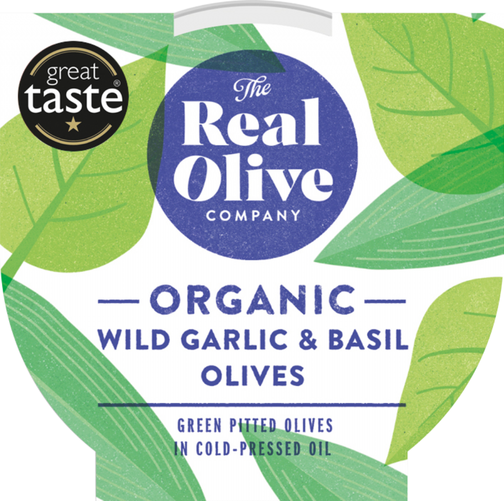 THE REAL OLIVE COMPANY Organic Wild Garlic & Basil Olives - Deli Pot 150g from The Real Olive Company.