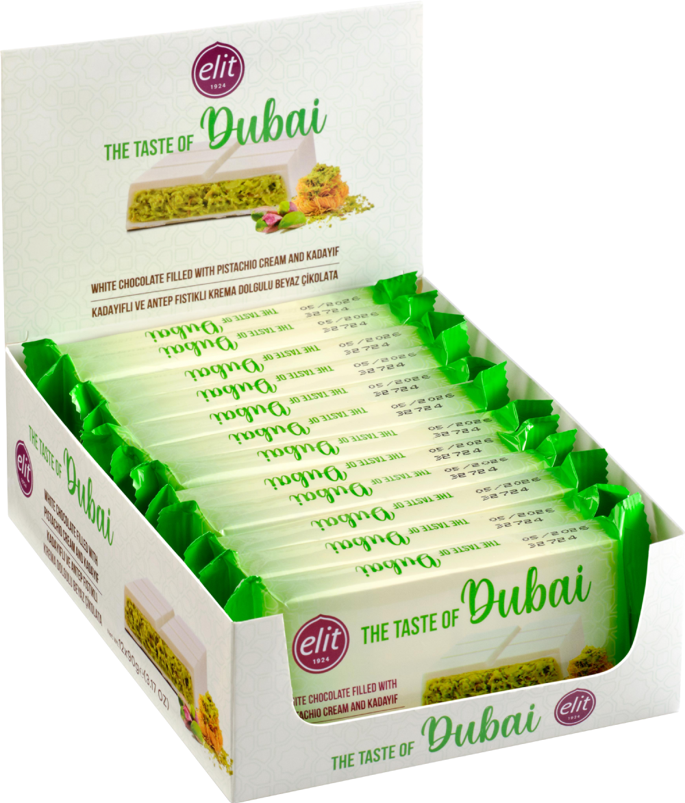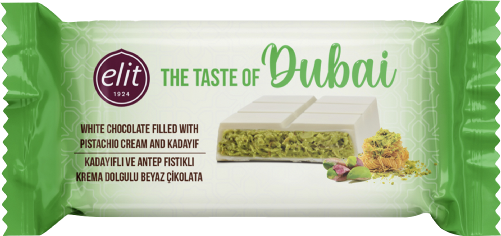 Taste the Difference: Dubai Chocolate by Elit! Crispy, crunchy kadayif meets carefully selected pistachios via the mastery of Elit Chocolate. This unique combination offers a magnificent taste experience where traditional flavours are blended with a modern interpretation. The crunchiness of kadayif, the rich aroma of pistachios and the touch of Elit White Chocolate combine to offer an unforgettable taste journey with every bite! Try the White chocolate variant now to taste the difference!
