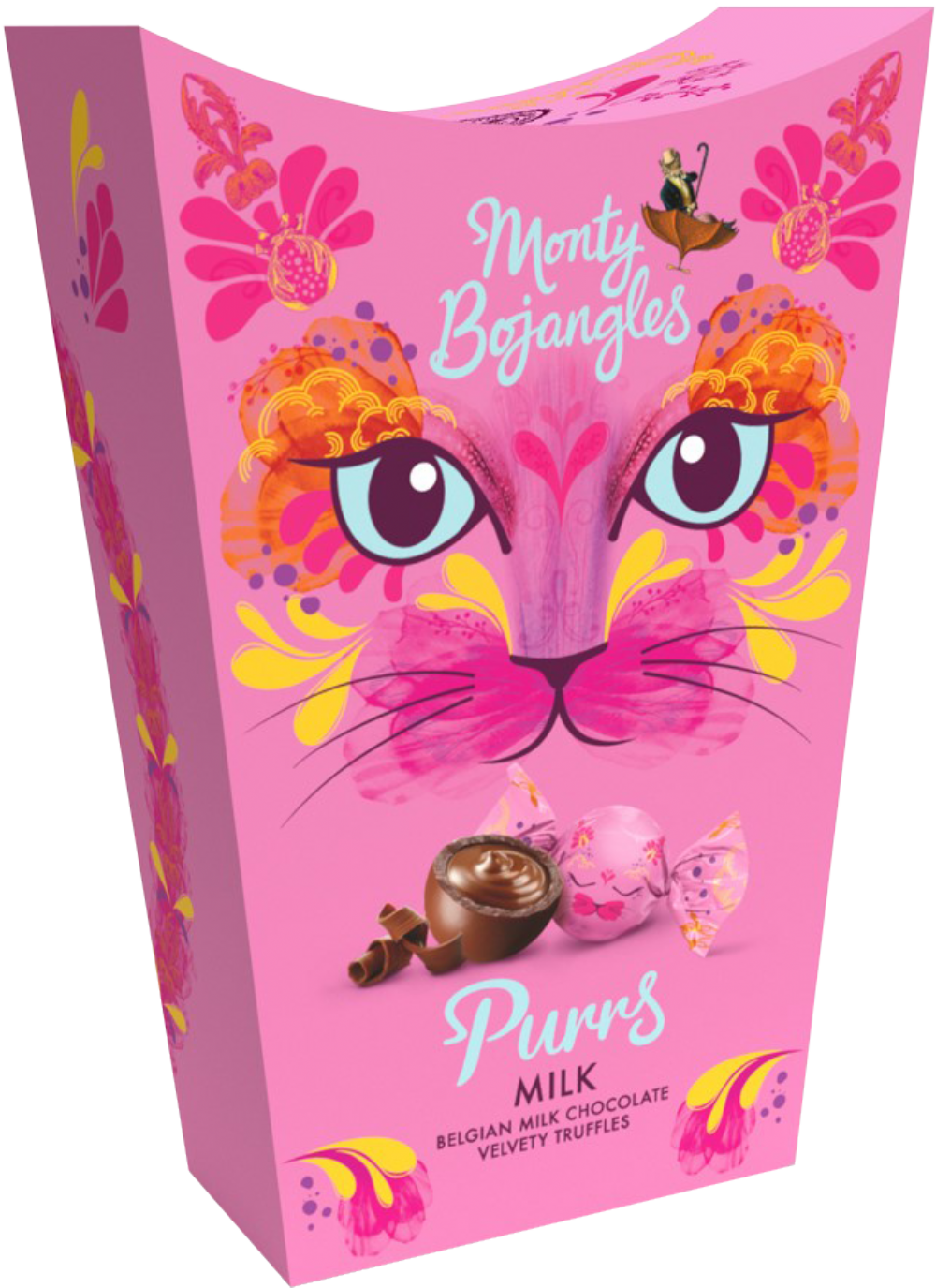 Monty Bojangles Purrs Milk Chocolate Velvety Truffles come in a delightful pink gift box adorned with whimsical cat designs on both the wrappers and the box itself. Indulge in the rich, velvety goodness of these truffles, each bite offering a luxurious experience of smooth milk chocolate. With their charming feline-themed packaging, these truffles make for a purr-fectly delightful and visually appealing gift for any chocolate lover.