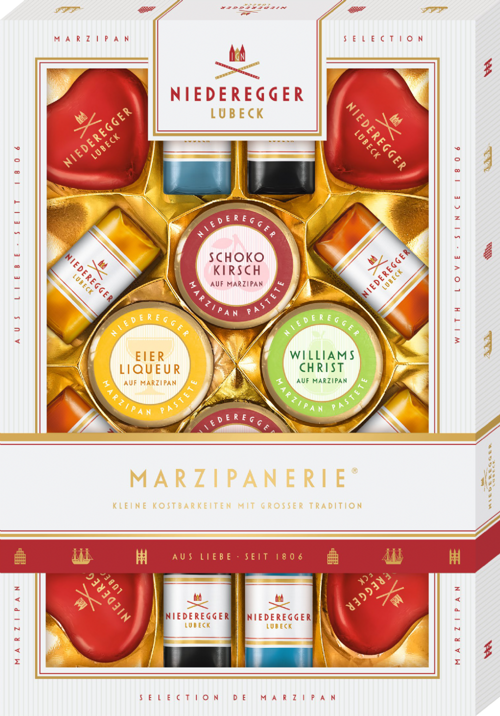 The Marzipanerie combines exquisite marzipan hearts, filled chocolate coins and popular classics in a prestigious gift box. The high almond content ensures a smooth, juicy texture and authentic flavour. Enveloped in dark, light and white chocolate, fruity notes of cherry, orange and Williams pear unfold, refined with selected spirits and a hint of coffee and cocoa. Perfect as a stylish gift, to share with guests or for your personal indulgence break. Carefully composed and varied in selection - for all those who love high-quality marzipan specialities. The finely balanced sweetness and aromatic almond flavour go perfectly with espresso and desserts. Produced in careful confectionery quality, the selection offers a harmonious blend of classics and filled specialities.