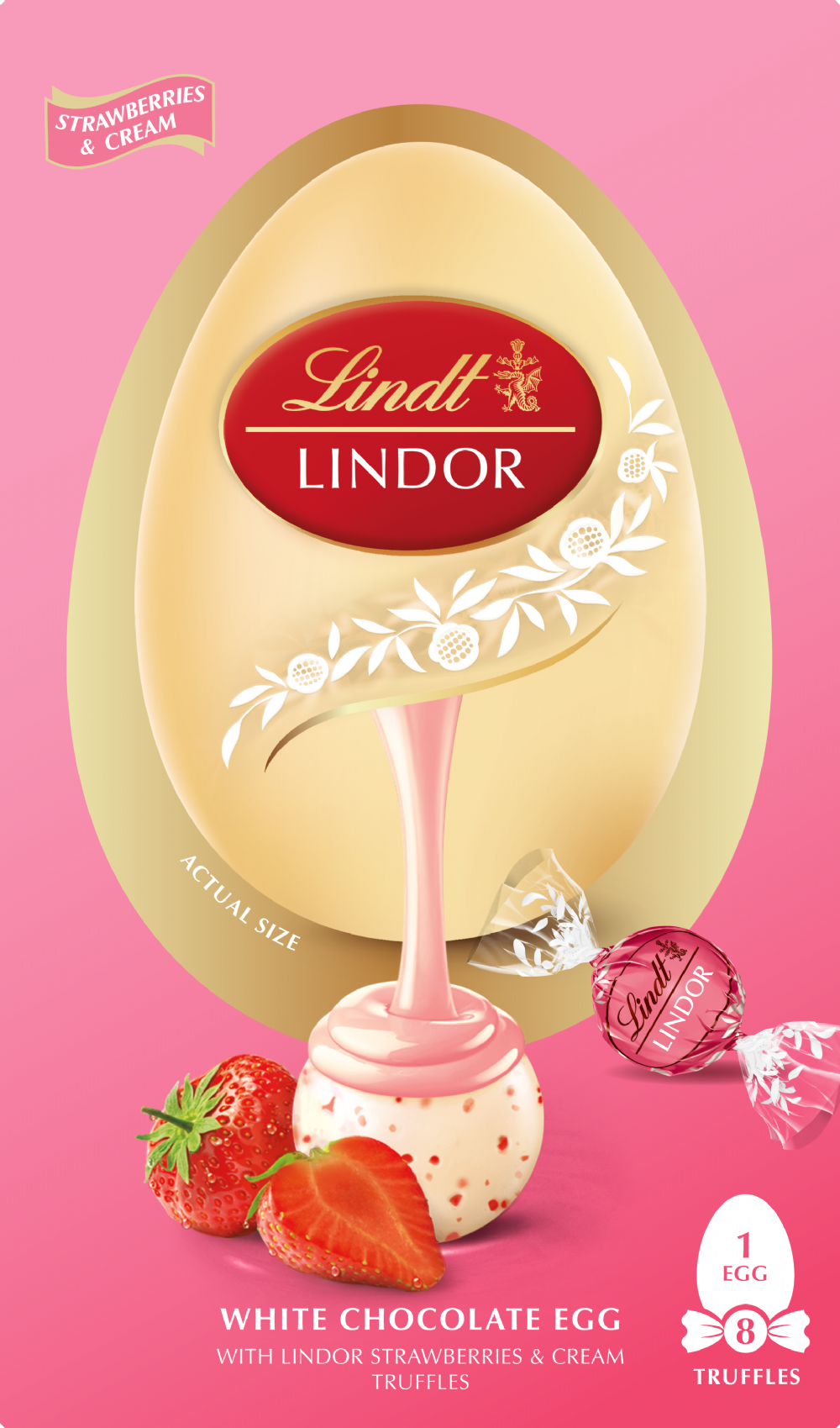 A smooth white chocolate egg with white chocolate with Lindor Strawberries & Cream Truffles. Wherever and whenever you take a Lindor moment, it just seems to make life feel so much more sublime. When you unwrap Lindor and break its delicate chocolate shell, the irresistibly smooth filling starts to melt, gently carrying you away in a moment of bliss.