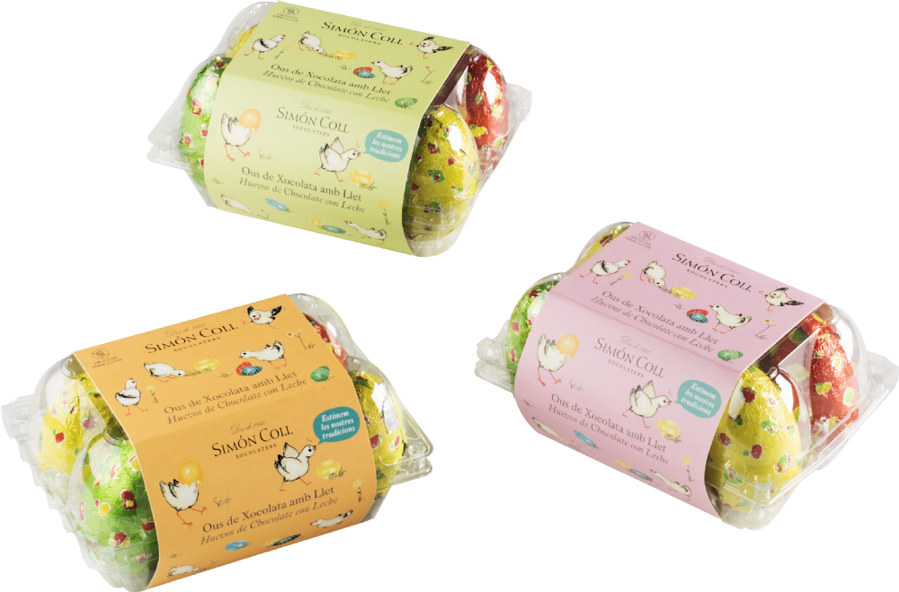 Egg-cup with 6 milk chocolate tinned eggs, all of them covered with aluminum and an Easter chick design. For those who love the creaminess and the flavour of Simón Coll milk chocolate. Our chocolate is gluten-free, made with natural ingredients and without artificial additives. Ideal to share with the whole family during Easter or to play a game, so that the little ones in the house can find them. Kids can reuse the egg-cup and use it as a liquid paint container or use it for crafts.