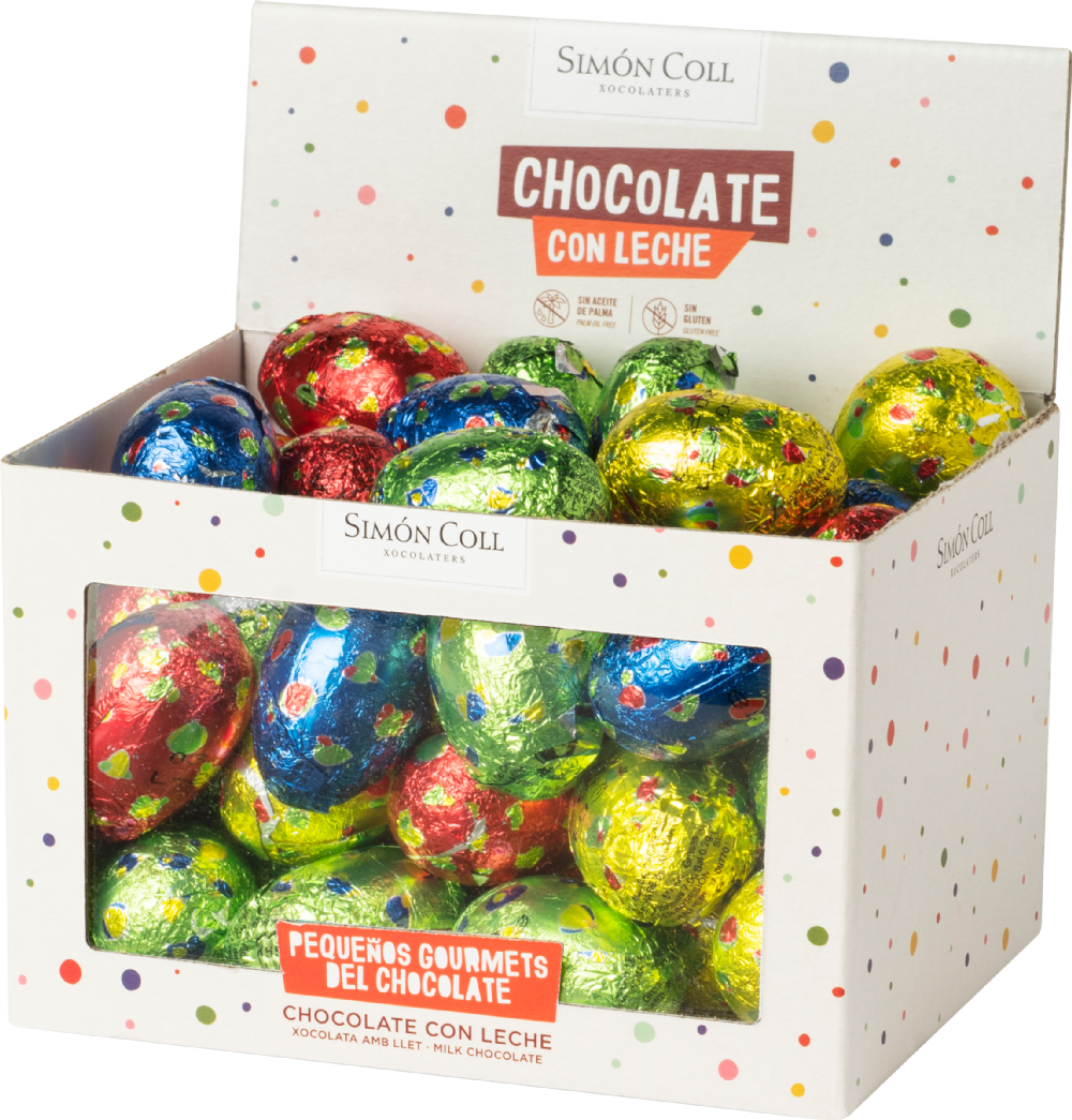 30% milk chocolate eggs that are hollow inside and with aluminium wrapping featuring designs of Easter chicks.