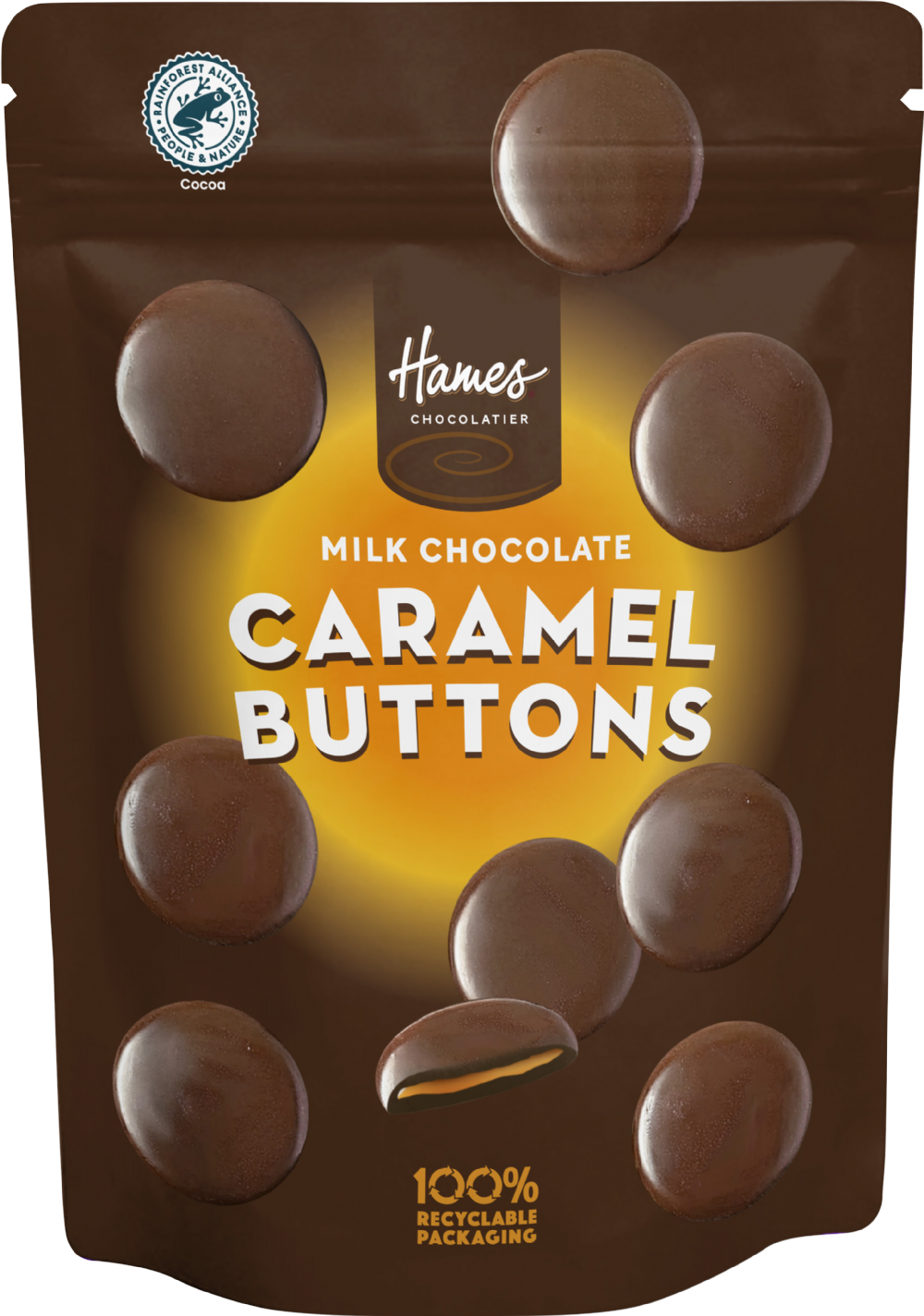 Hames presents a sumptuous collection of luxury giant chocolate buttons filled with a rich, silky caramel centre, expertly crafted to delight even the most discerning palate. A truly indulgent treat for those who appreciate the finer things in life. Made in the UK with Rainforest Alliance certified cocoa and packed in a 100% recyclable pouch.Â