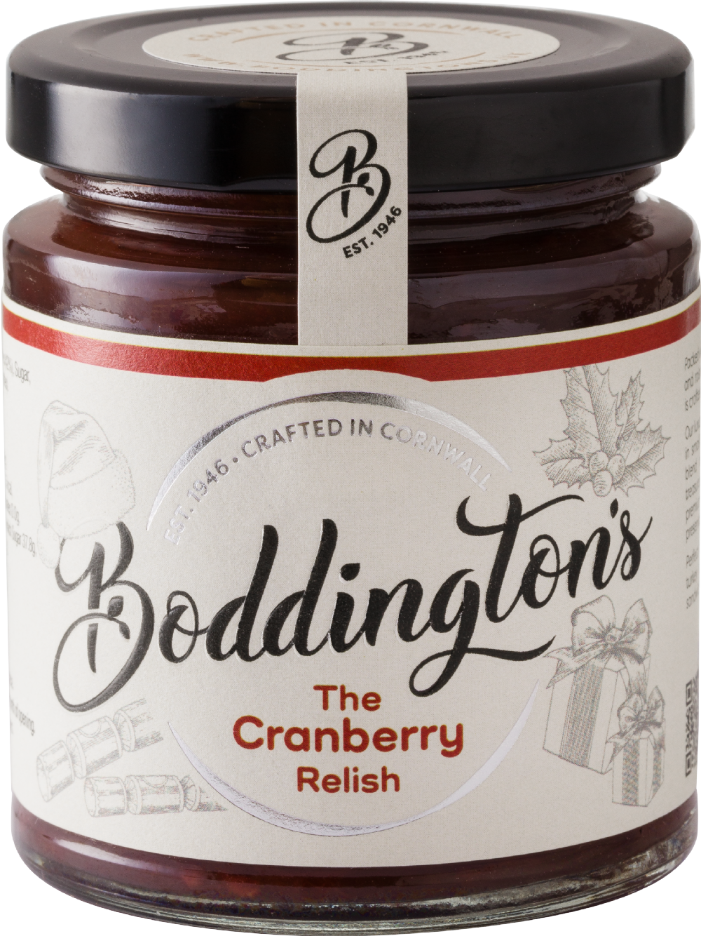 Packed with juicy cranberries, zesty orange and raisins, Boddington's Cranberry Relish is crafted on our family farm in Mevagissey. Our luxurious relish is carefully slow-cooked in small batches to create a harmonious blend of tart and sweet, using our treasured recipe. We take pride in our premium ingredients, with no artificial preservatives. Perfect for complementing your Christmas turkey or adding zest to your festive sandwiches.