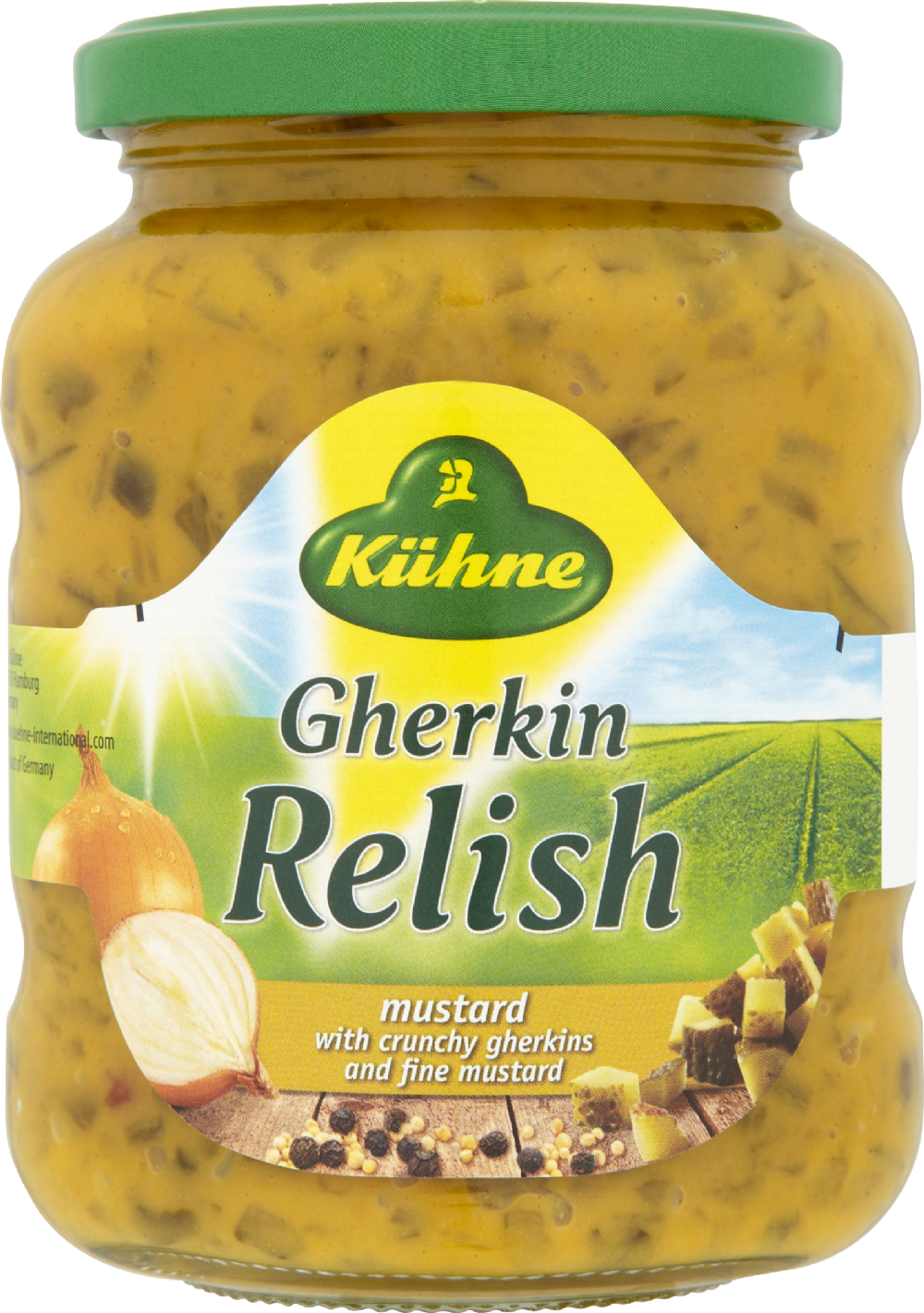 Mustard gherkin relish with crunchy gherkin cubes and mustard. Complements meat dishes, sandwiches or hot dogs.