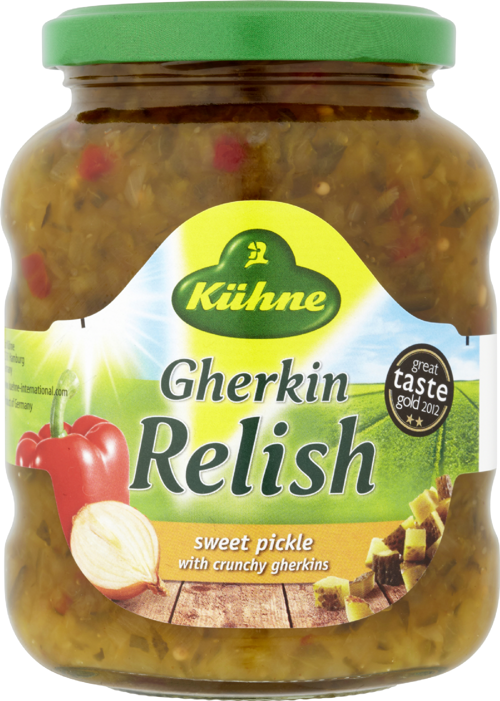 Sweet pickle relish with crunchy gherkin cubes and pieces of paprika. Complements meat dishes, sandwiches or hot dogs.