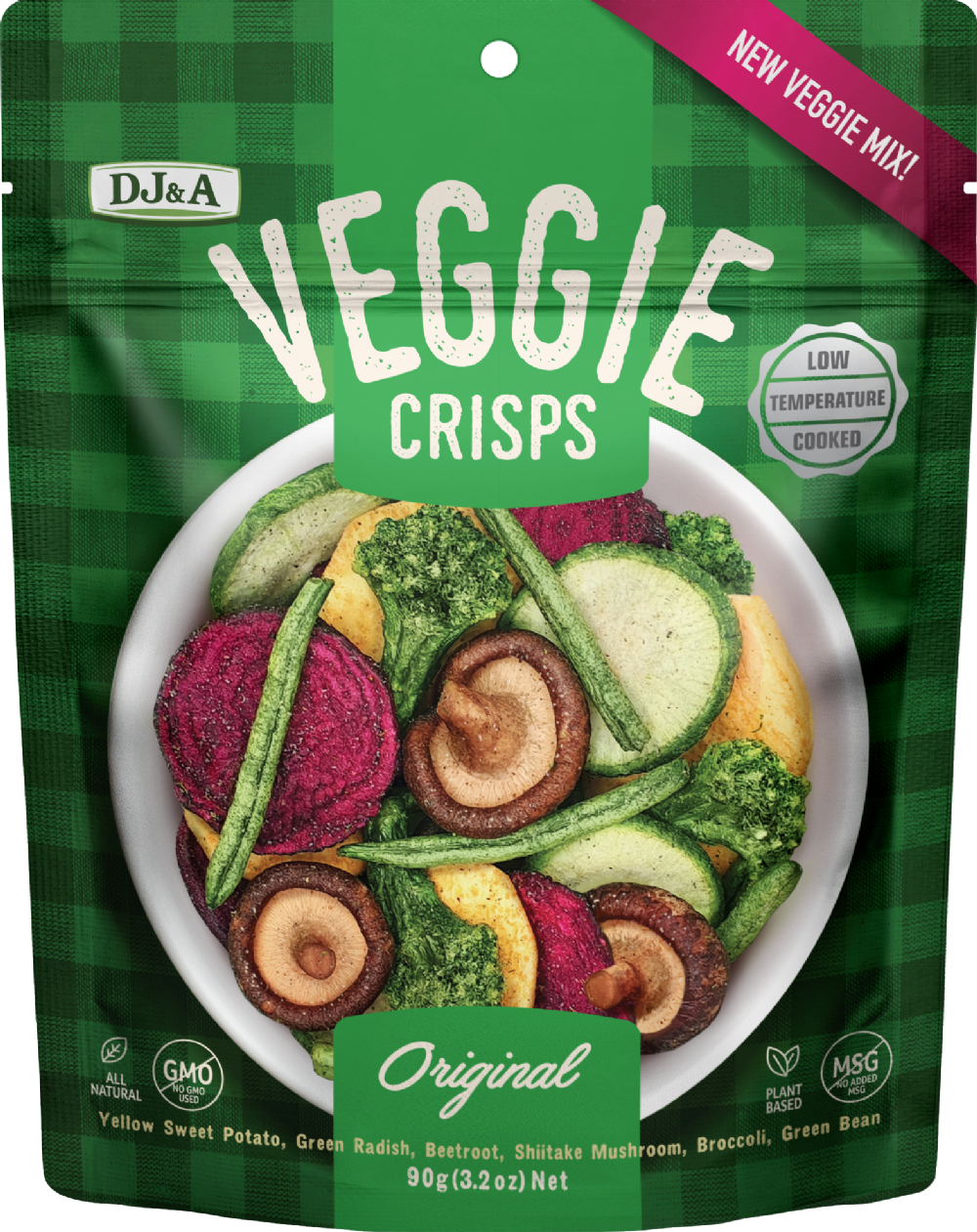DJ&A Veggie Crisps is a ready to eat snack that is all natural, plant based, good source of dietary fibre and has 30% less fat than regular fried potato chips. It contains no added MSG, no genetically modified vegetables and no artificial colours, flavours or preservatives.