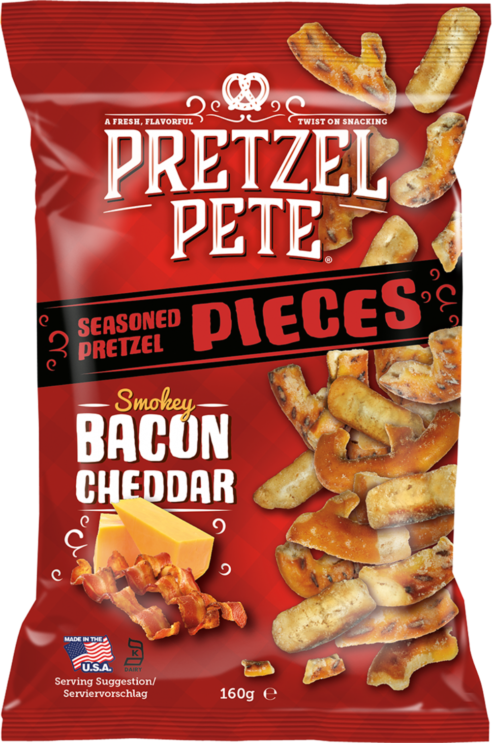 Pretzel Pete's smoky bacon cheddar pretzel pieces feature a seasoning blend of buttermilk, onion powder, garlic powder, natural smoke flavour and natural cheddar flavour. Genuine product of USA.
