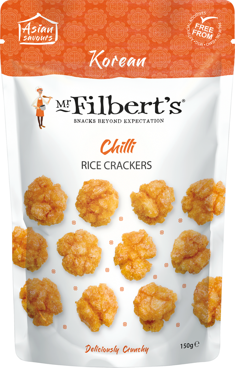 Mr Filbert's spicy chilli rice crackers are seasoned lavishly with warm chillies and a good pinch of spice for a crunchy savoury snack.