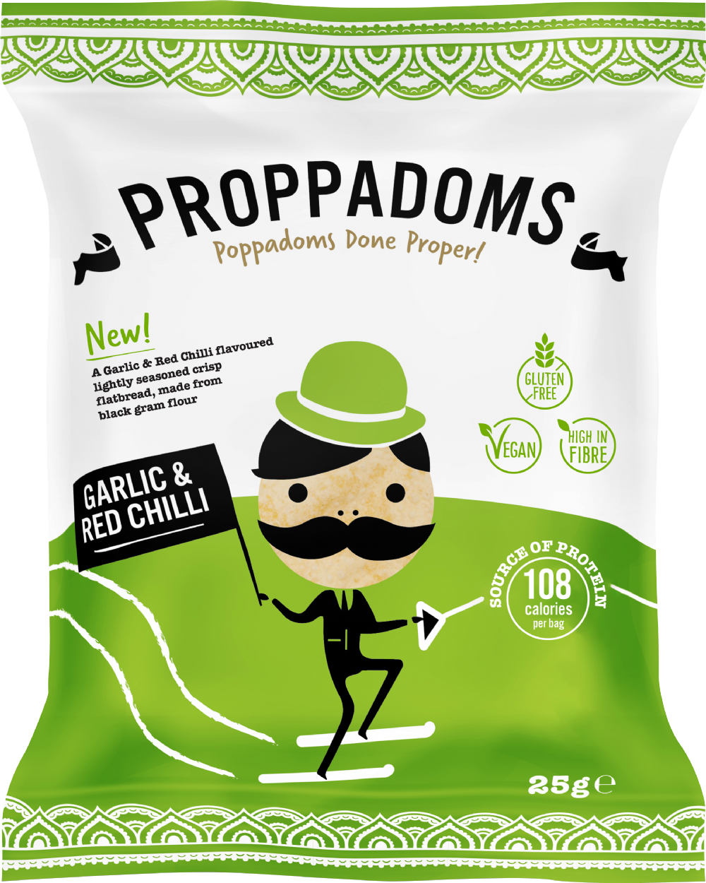 Proppadoms are Poppadoms done Proper! If you are looking for a taste sensation then Propperdoms are the perfect snacks for you; garlic and red chilli flavour will send your tastebuds into a frenzy! These delicious snacks are perfect for both kicking back and relaxing and when entertaining.Â