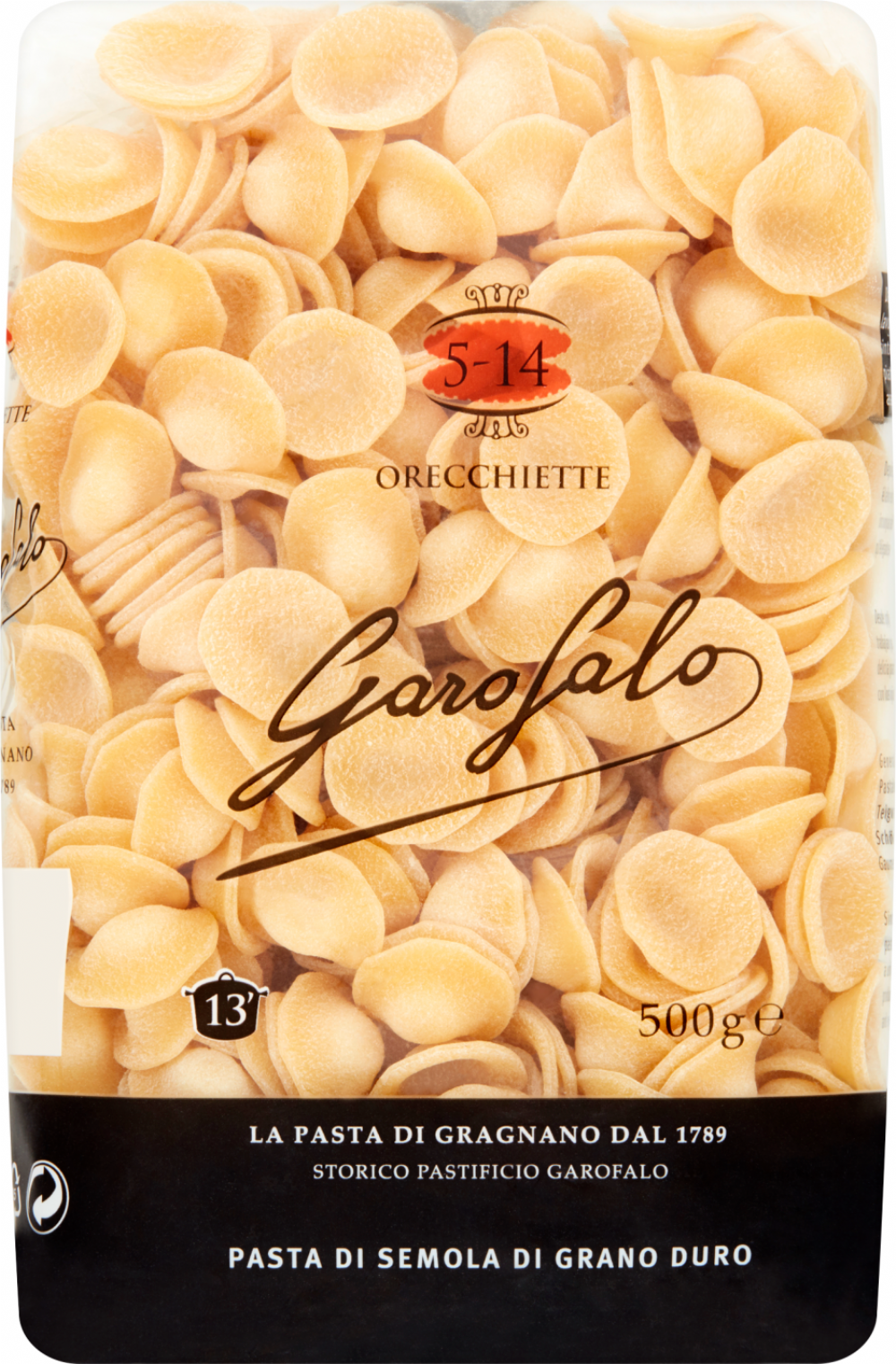 Orecchiette are typical of Puglia, a region of southern Italy. Their name comes from the shape, which looks like a small ear. In Italian 'orecchio' means 'ear', and the suffix 'etto' means 'small'. Orecchiette are about 1.75 cm across and slightly domed with thinner centres compared to the edge giving them a variable texture and a place to catch the sauce.