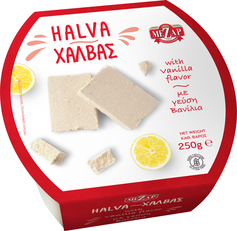 Genuine traditional Greek halva from Thessaloniki. Originating from the Middle East, this rich and tasty sweet treat may be enjoyed as a dessert or broken into other desserts and recipes.