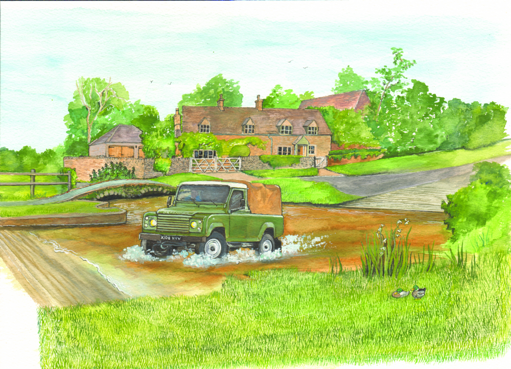 SUE PODBERY Land Rover Crossing Ford Card from Sue Podbery.