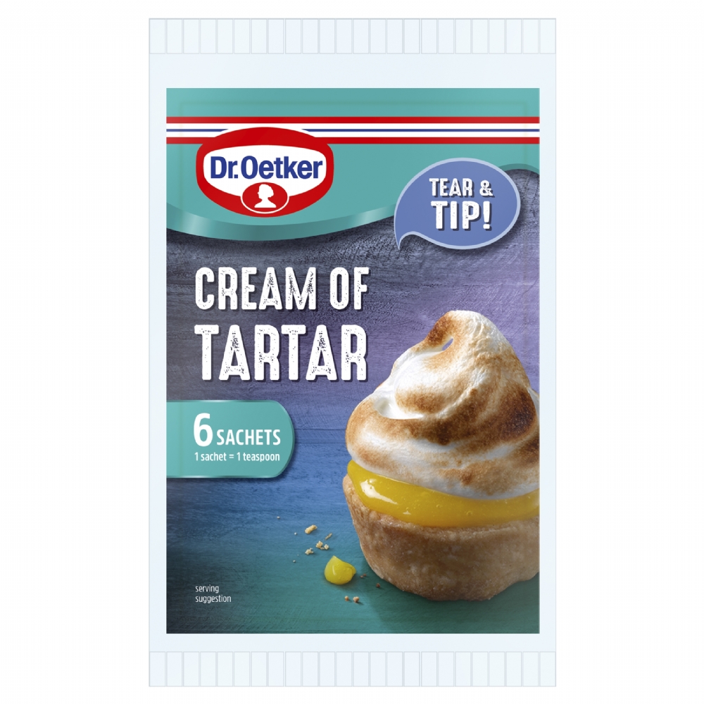 Dr. Oetker Cream of Tartar helps to increase the volume and stability of whisked egg whites in meringues and soufflés. The 6 sachets each contain 1 teaspoon for easy usage. Cream of Tartar can also be used to make a homemade playdough.