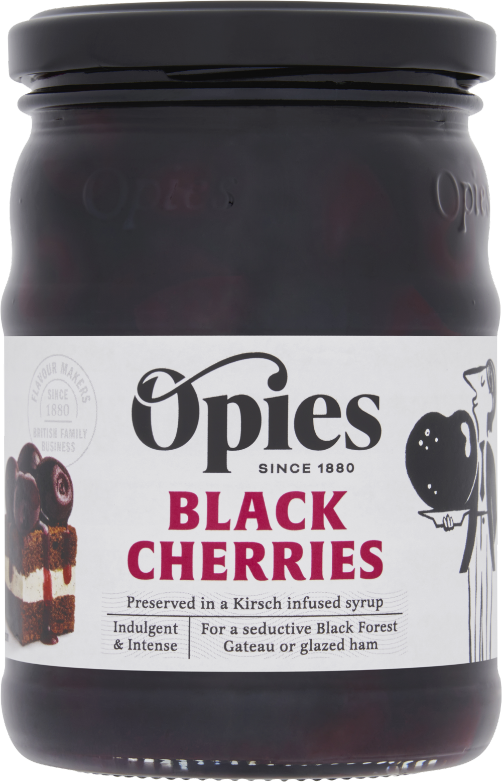 Our luxurious black cherries, invite you into a world of pure decadence. Crown your cakes, boost your brownies, add flair to your Prosecco or even pair with goat's cheese for a surprisingly delicious duet; every serving is sure to impress. These intensely flavourful black cherries are slowly marinated in a luxurious Kirsch-infused syrup, giving them a sweet, full-bodied aroma.