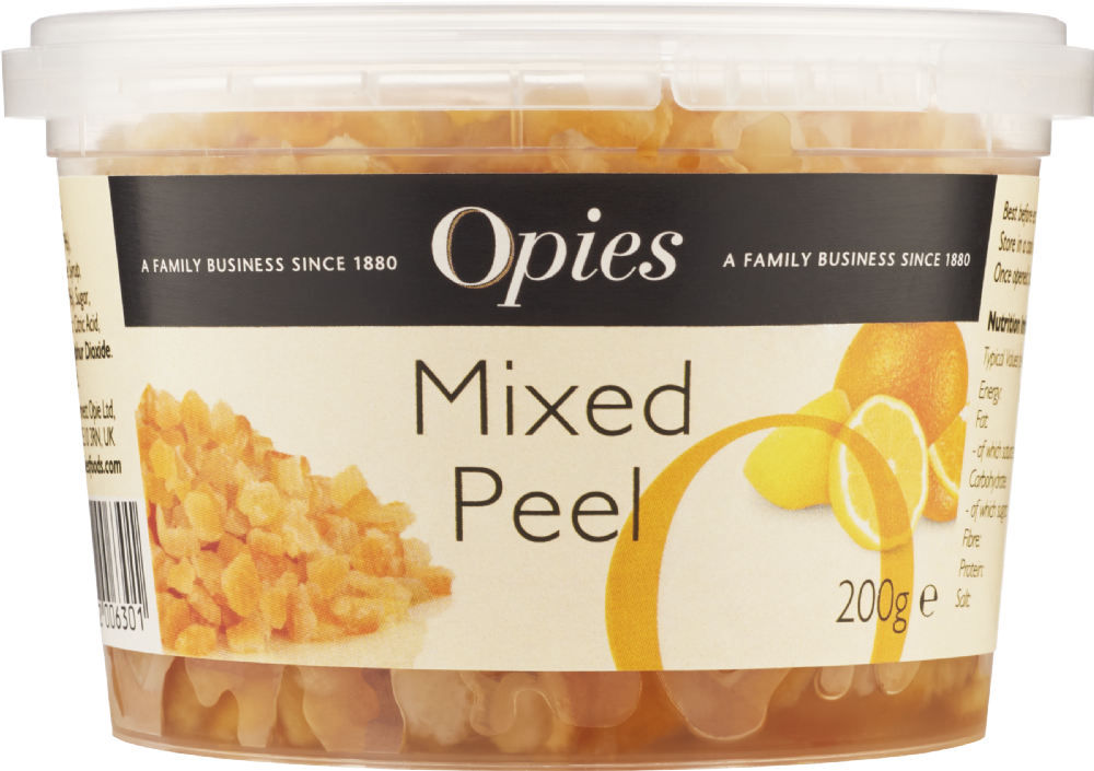 Opies Mixed Peel is a delightful combination of candied citrus peels, including orange, lemon, and citron.